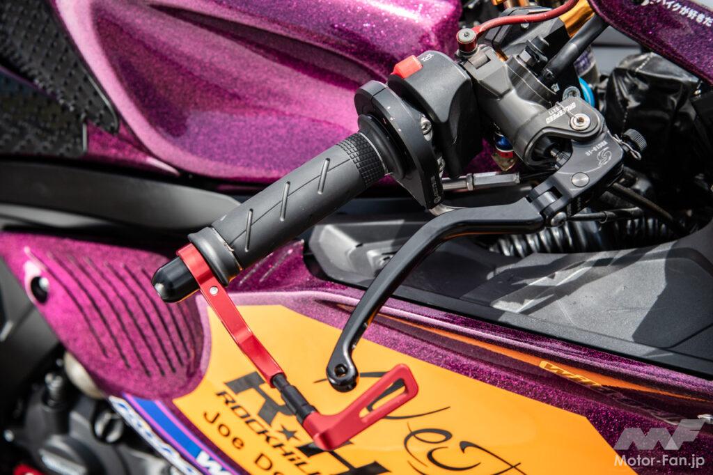 ハンドルバーはT TECH製とし、マスターシリンダーはゲイルスピード製のラジアルマウントを採用。ブレーキレバーが他車に接触しにくいよう、レバーガードも装備されている。