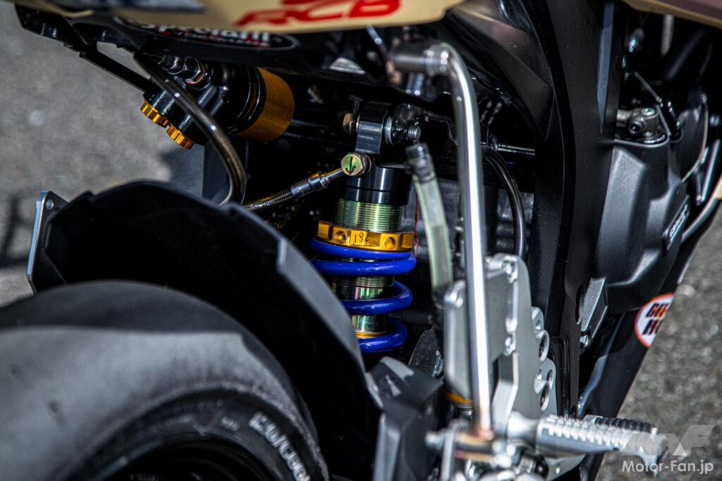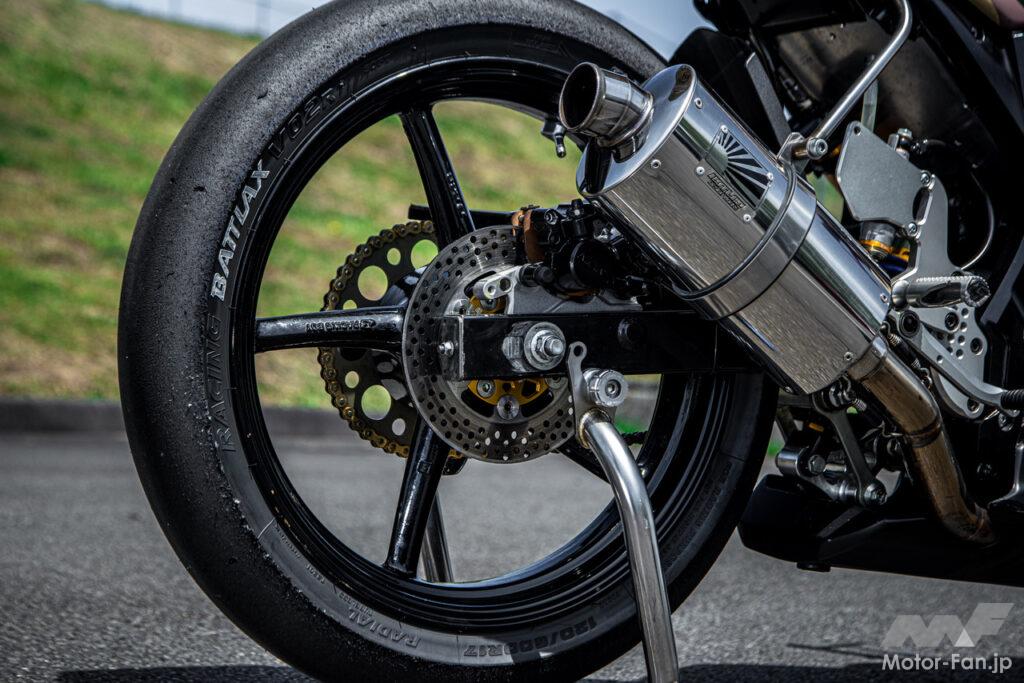 マフラーはHOT LAP製の楕円サイレンサー仕様とし、リヤホイールはフロント同様RCB製を採用。リヤのディスクローターはKN企画製として、ブリヂストン製スリックタイヤを履く。