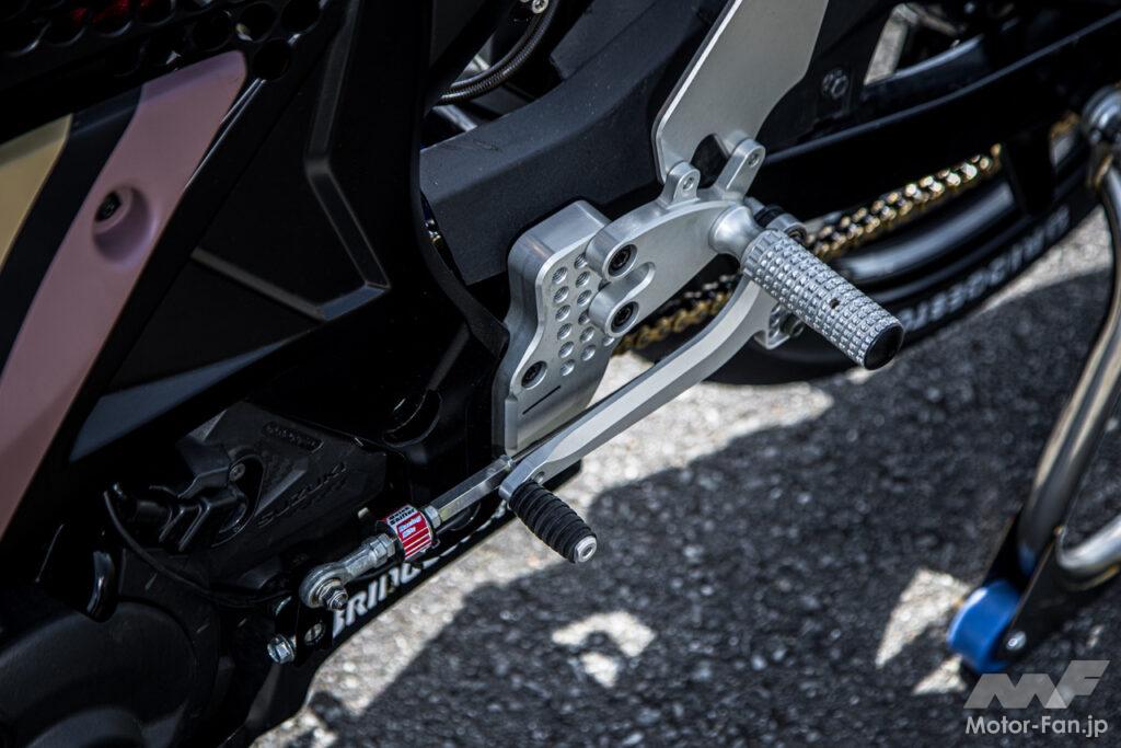 豊富なポジションをチョイスできるスーパーナウエンジニアリング製のアルミ製ステップには、チェンジロッド部分にaRacer製のクイックシフターを装備。シフトアップ時のロスを極限まで低減する策が施される。