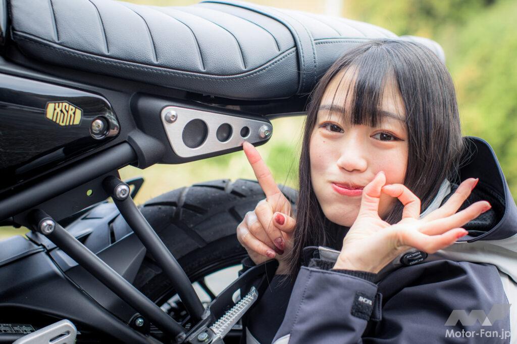 XSR125は私の大好きなタックロールシート。厚みがあって長時間走行しても疲れにくく、ライディングの自由度も高くて嬉しいんです。座面が広いので、荷物を積んで長距離ツーリングもいいかも。グラブバーは付いていないけれど、このあたりも自分好みにカスタムしていくのも楽しみの一つになりそうですよね。