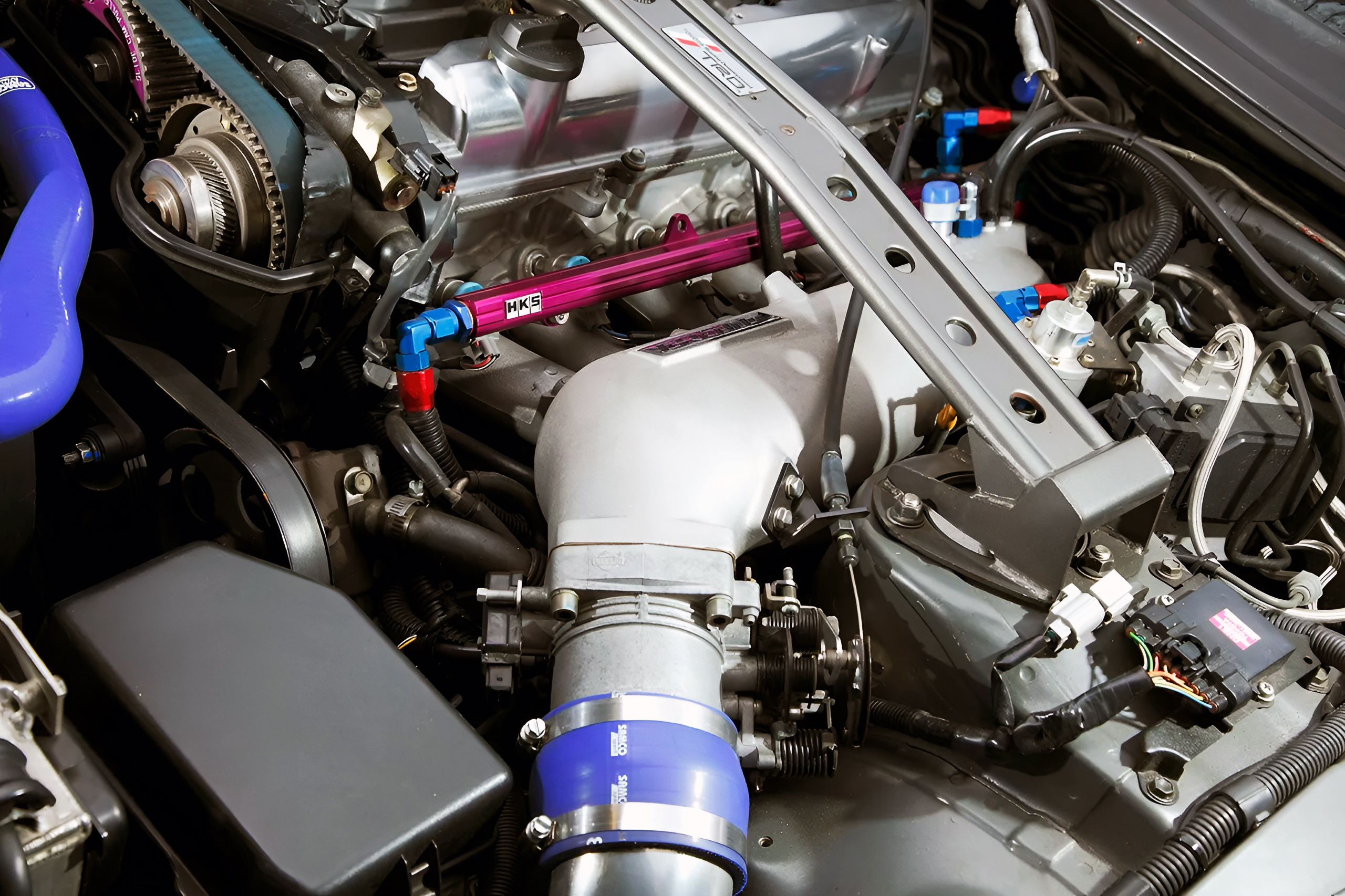 腰下はJUNの87φピストンとI断面コンロッドを組んで3.1Lまでスケールアップ。ヘッドにはポート加工を施した上で、HKSのハイカム(IN264度8.6mm EX280度9.3mm)を投入。マネージメントはF-CON Vプロだ。