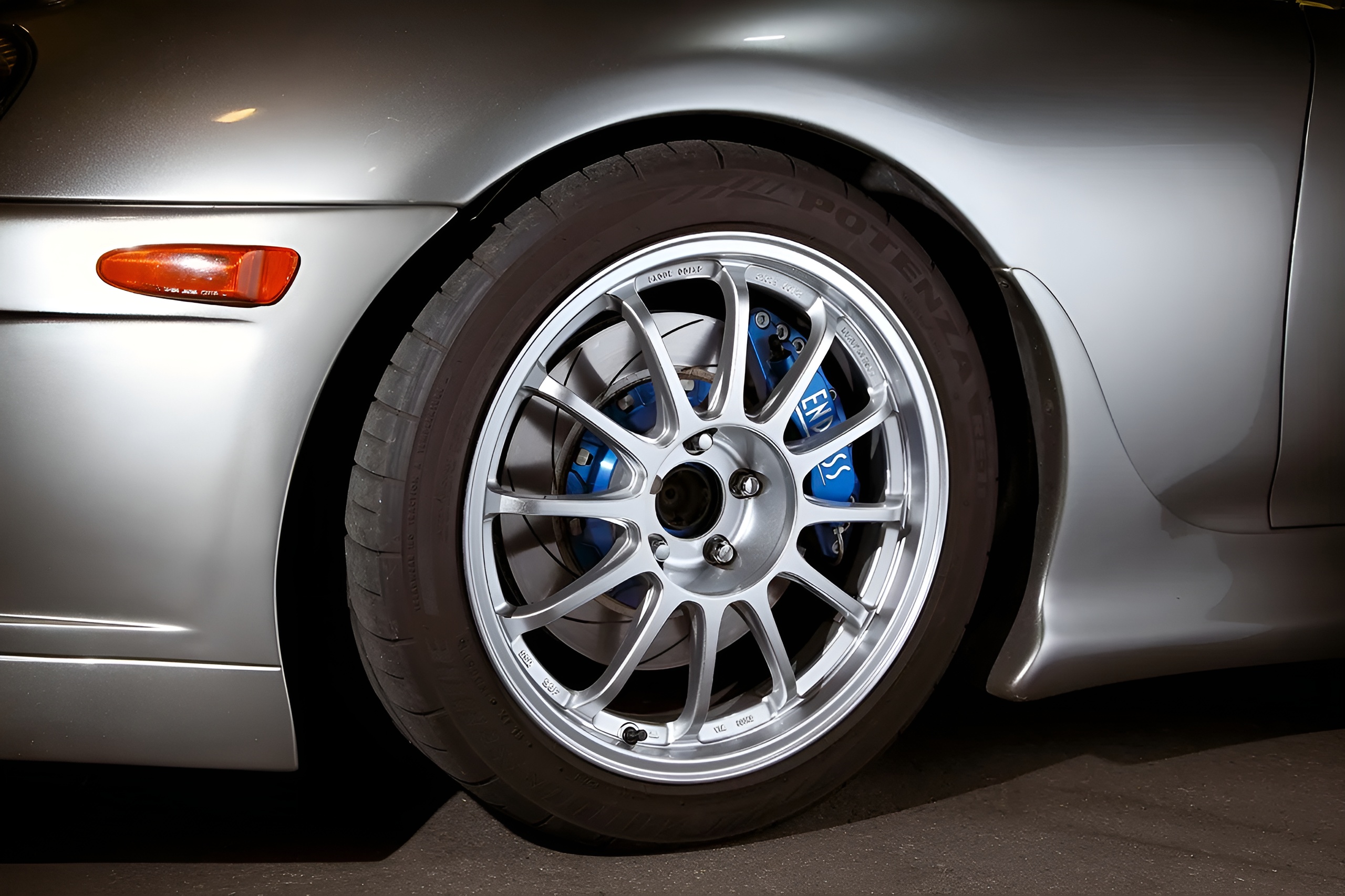フロント9.0J、リヤ10JのSSRタイプCに245/40-18、265/35-18サイズのポテンザRE-11を装着。足回りは、HKSハイパーマックスダンパーとイケヤフォーミュラの調整式アームでセットアップ済みだ。ファイナルギヤは3.2としている。