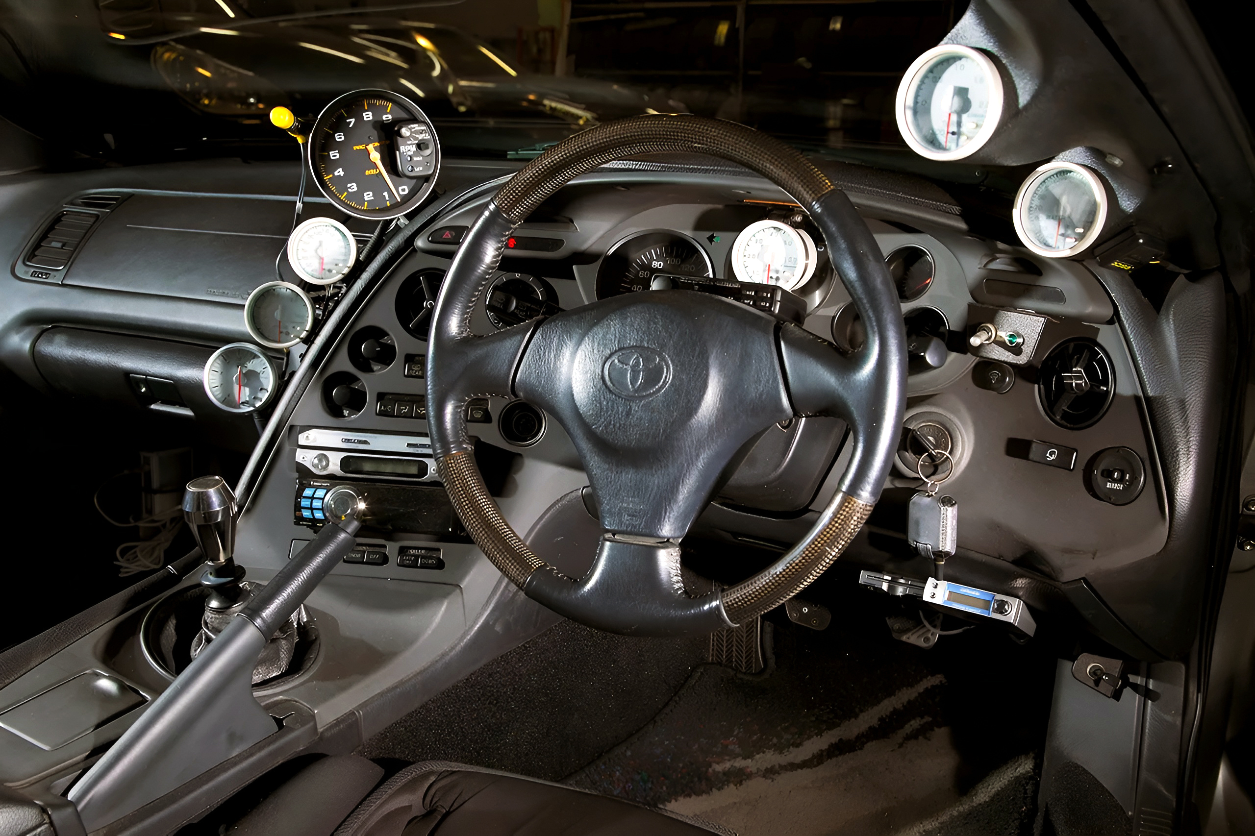 グレッディシリーズ&オートメーターPRO COMP2など、計7つの追加メーターがドライバーを取り囲むように配備された戦闘的なコクピット。なお、アタック時のシフトアップポイントは8400rpmであった。