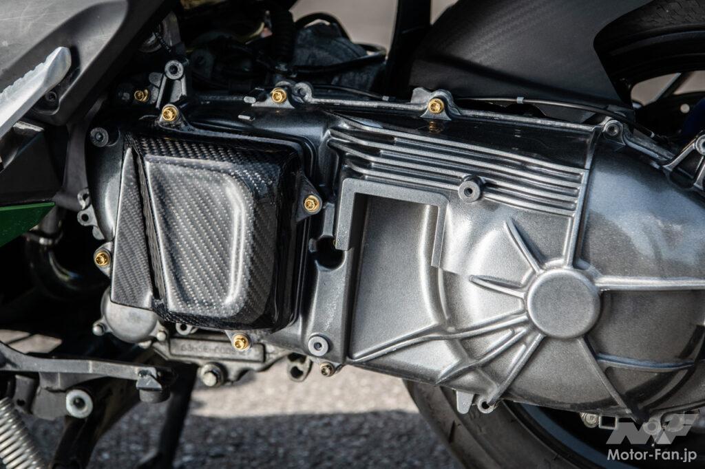 駆動系カバーのドライブ側にはカーボン製のインテークを装着。