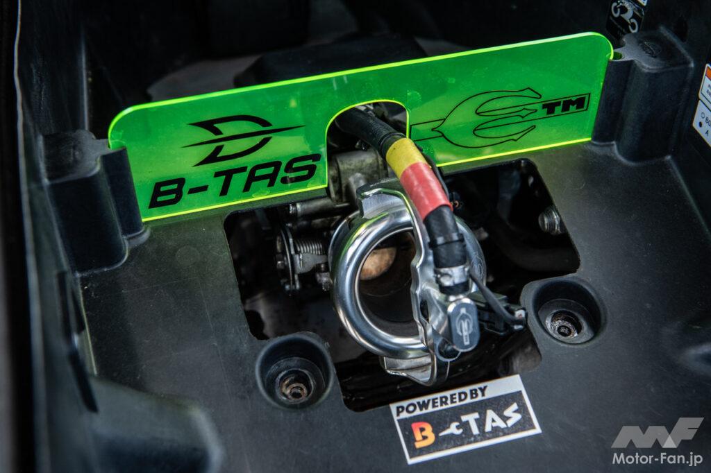 シート下すペースにはφ40mmのダウンドラフトとケーヒン製の追加インジェクターを装備。アルミ削り出しのファンネルはETM製となる。
