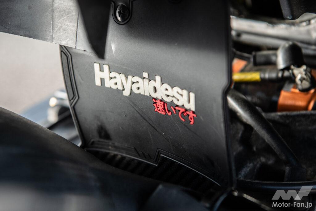 インナーフェンダーは海外で販売していたという「Hayaidesu」「速いです」と書かれたユニークなアイテムを盛り込む。