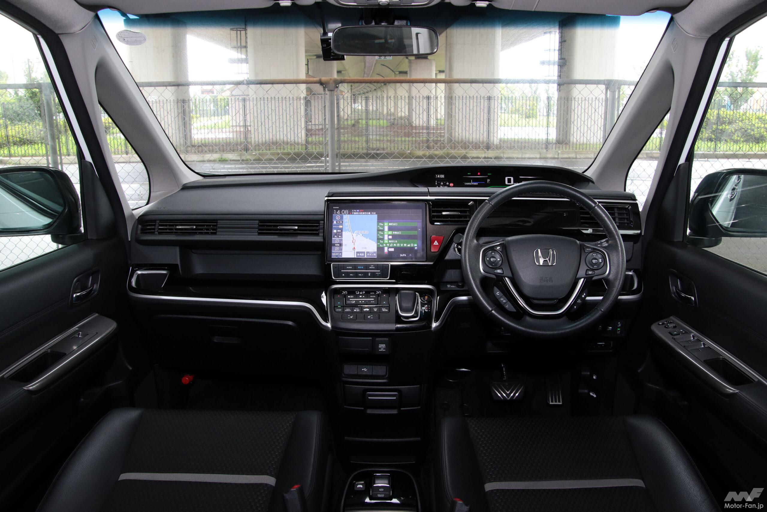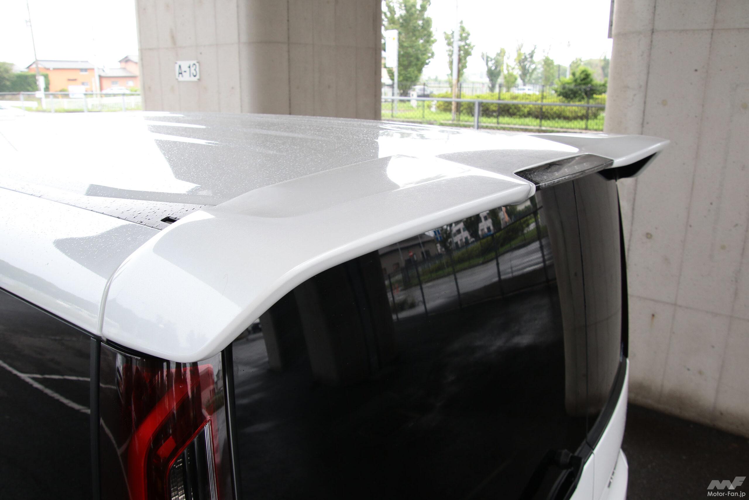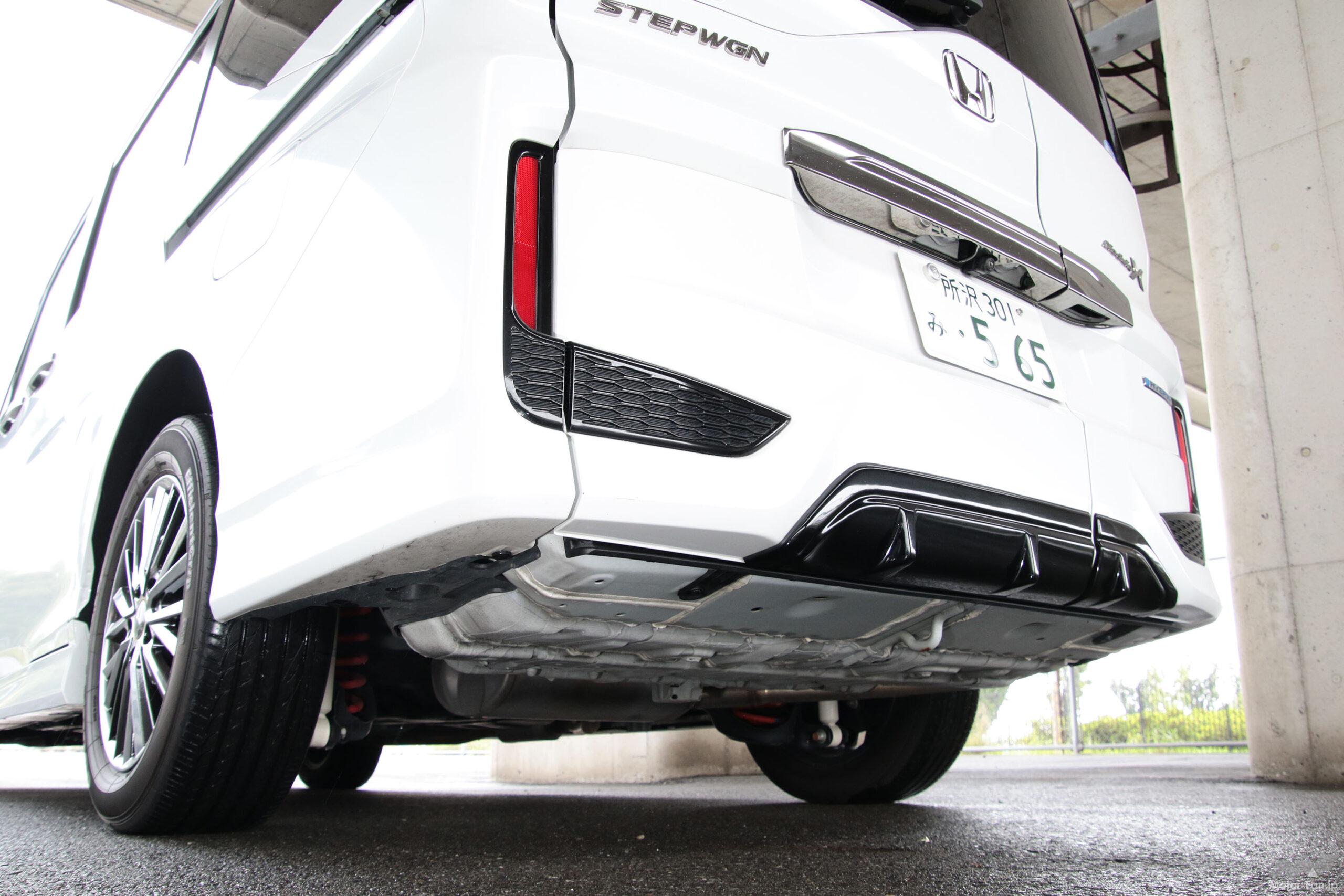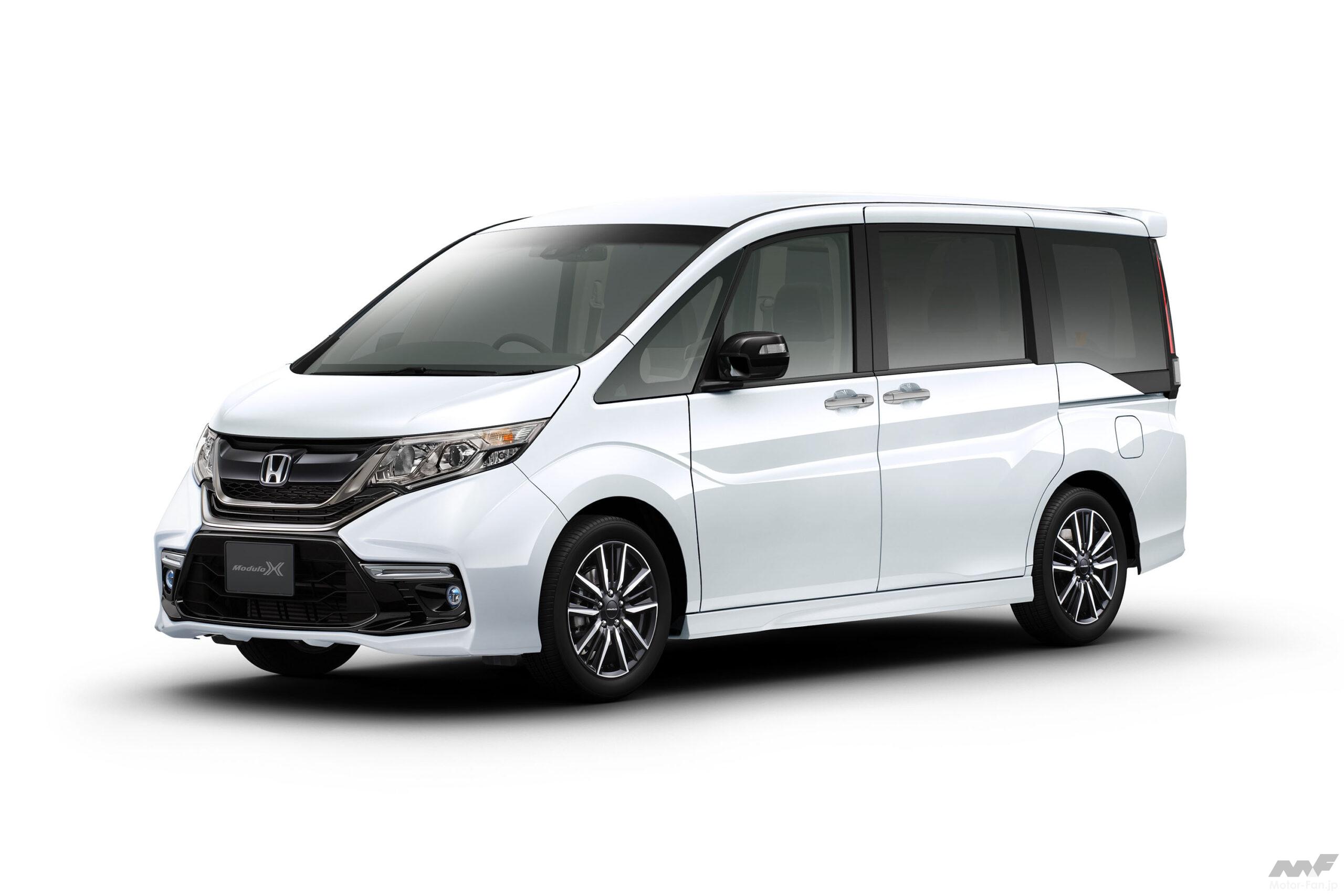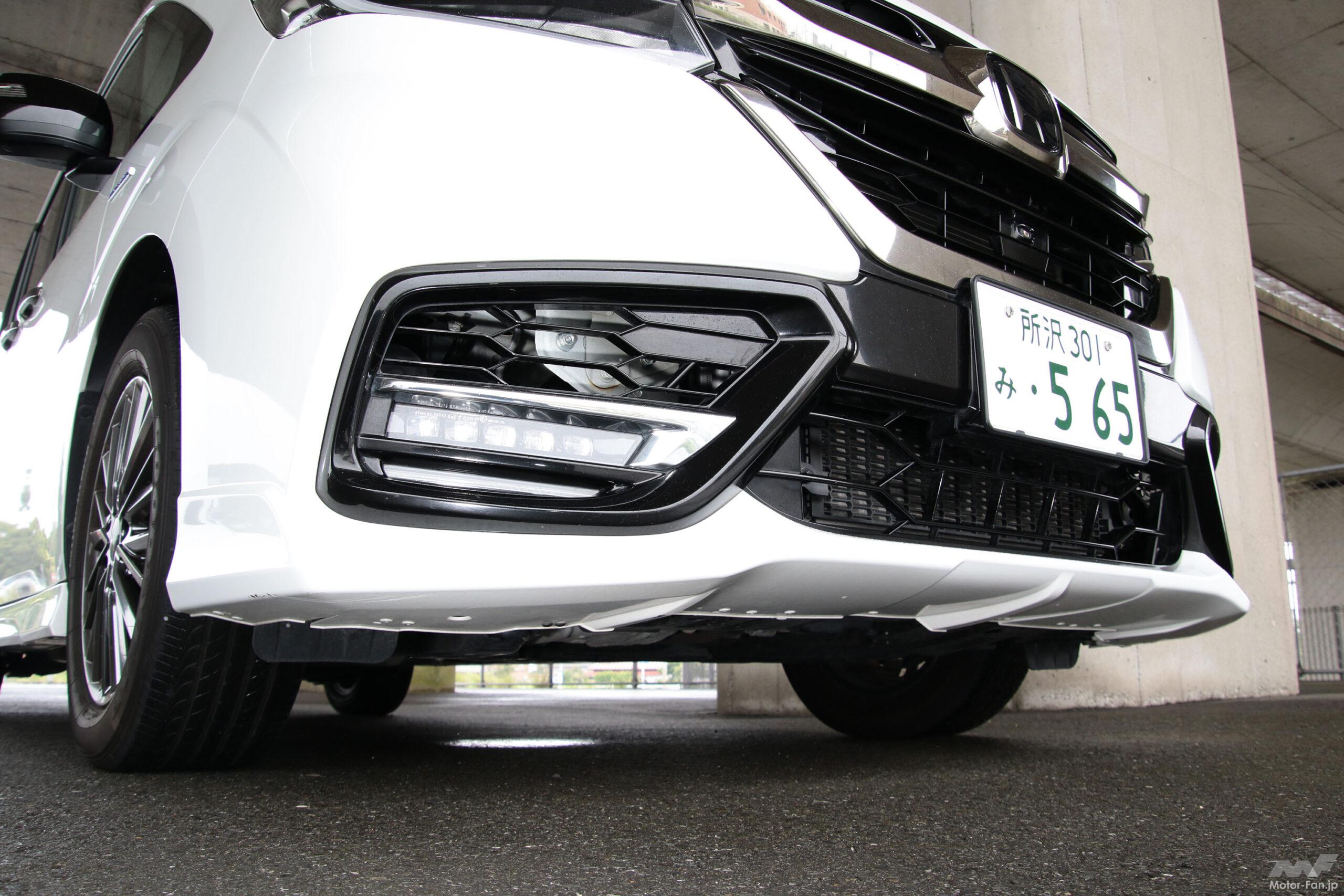 ボディ下面の空気の流れを整えて中高速域の操縦安定性を大幅に高める「実効空力」に基づき、実車での走行テストを重ねて決定されたエクステリアは、ベース車のスパーダよりもメッキパーツの色味も使用範囲も抑えられる一方、造形はマイナーチェンジ前のモデューロXと比較してもより一層レーシーなものに進化している。