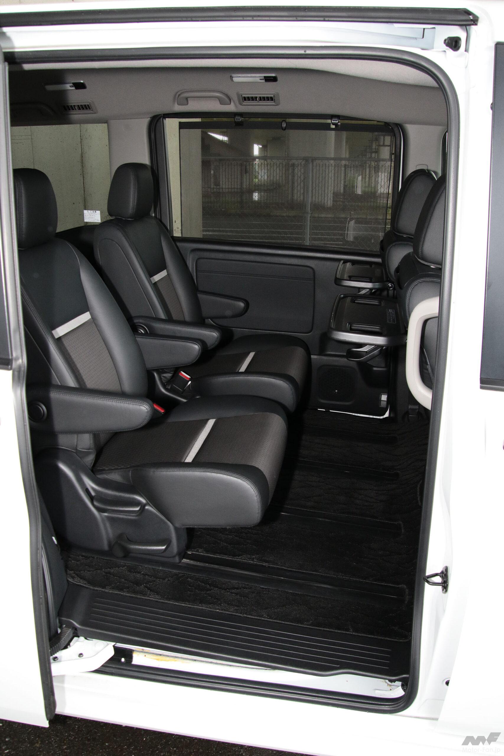 それが横に開くと、1ノッチ目で後方突出量は40cm&開口幅35cm(メーカー公表値)、2ノッチ目で同64cm&61cm、全開の3ノッチ目でも同76cm&83cmとなる。この際の取っ手の地上高は127cm(筆者実測)で、開口部地上高は44.5cm(メーカー公表値)と低いため、ドアの開閉や荷物の出し入れはもちろん、人の出入りさえ容易だ。
