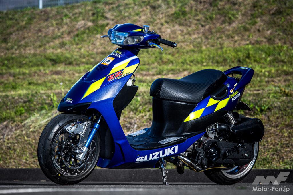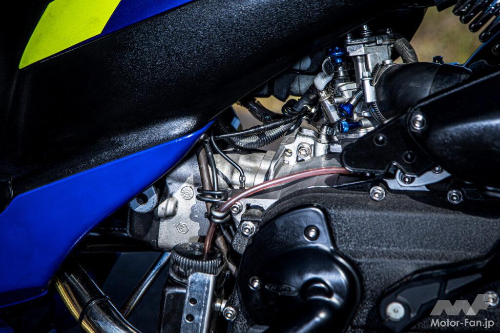 シリンダーはランナー180用をフルポート加工し、ヘッドはSIP製のビレットヘッドを装着。キャブレターはPWKφ28mmとしてZZ用のエアクリーナーBOXを加工して接続し、音量を低く抑えている。クランクはBGM製の55mmストロークで、10mmロングとなるコンロッドとなっている。