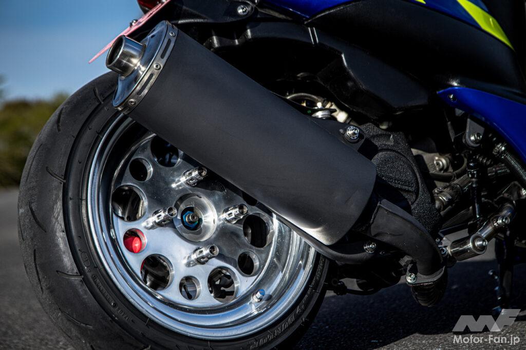 リヤホイールはスピードスターマーク1の5.5J13インチホイールを加工して装着。大小のホールが加工により盛り込まれ、ダンロップのTT93(120/70-13)を履く。マフラーは音量の小さなジャネリ製のスポーツタイプを採用。画像では見えないが、リヤにはマロッシ製ディスクローターも投入されている。