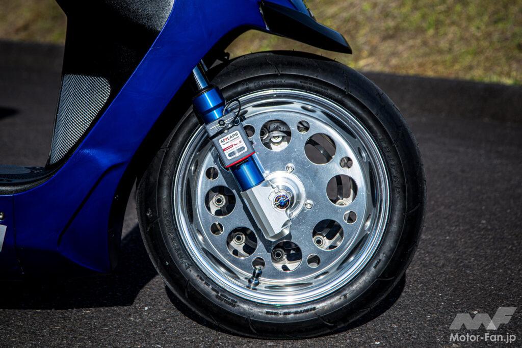 フロントホイールはデイトナ製の2.75Jの12インチを加工して装着。タイヤはダンロップTT93でサイズは110/70-12となっている。