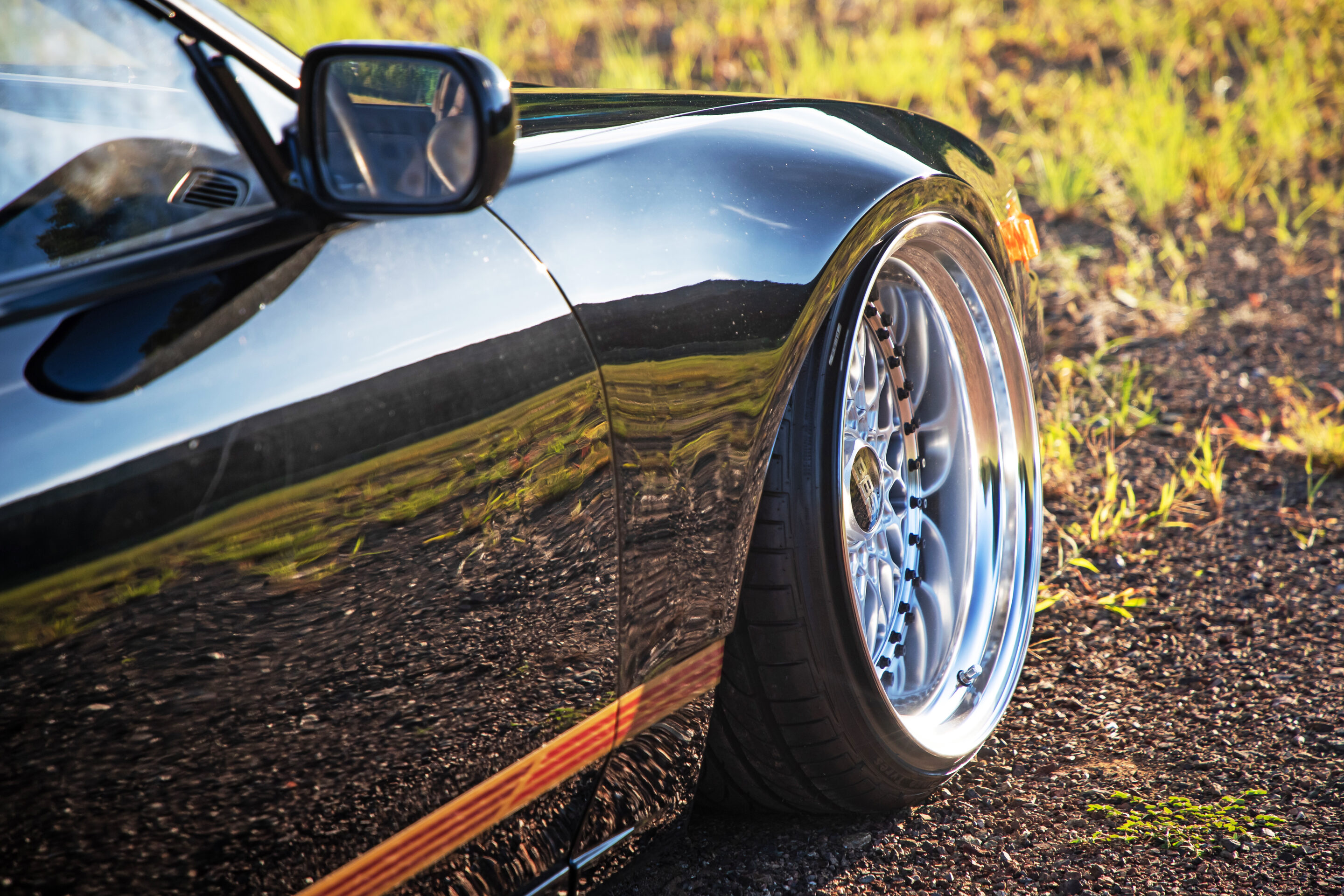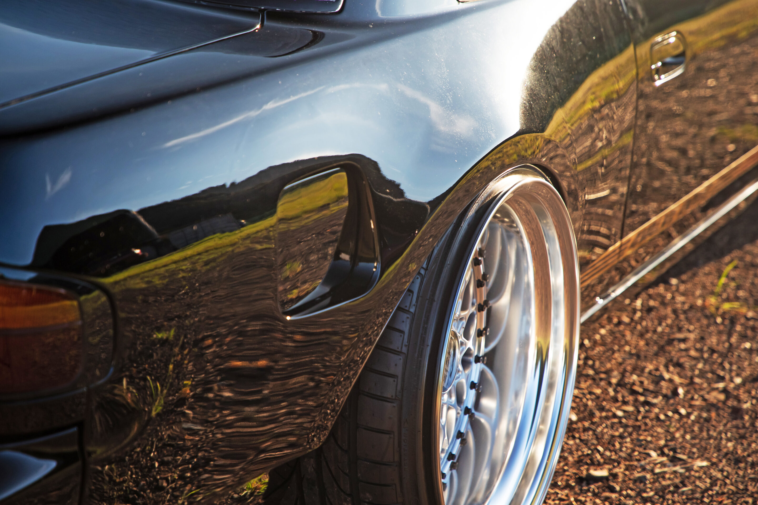 そしてエクステリア。純正フェンダーアーチの40mmほど切り上げて、フロント片側20mm、リヤ片側40mmワイドのオリジナルフェンダーをセット。なお、このフェンダーは前後セットで製品化(8万8000円/FRP)されており、取材車両はパテで繋ぎ目を埋めてナチュラルな曲線を描くシルエットを創出している。