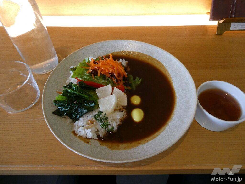 直売所を覗いて、カフェレストランで遅めのランチを取ることにした。地元産の野菜をタップリ使ったカレーとスープのセットを注文。緑の風景を眺めながらの食事を楽しんだ。