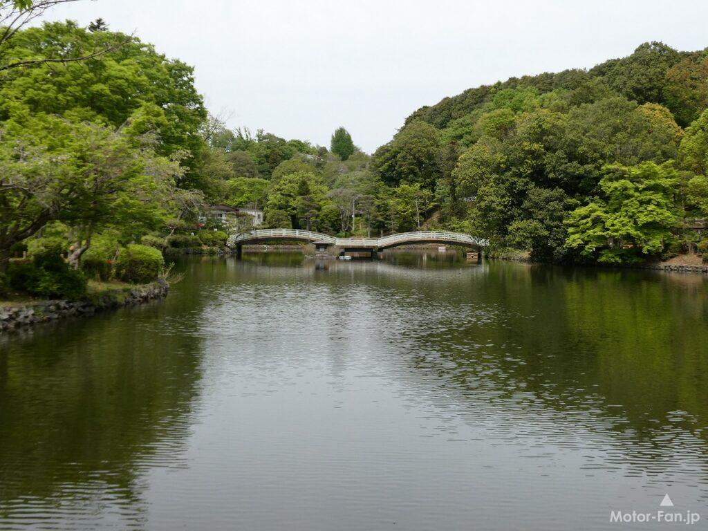 菜の花畑から住宅地の坂を下ること数分で薬師池公園に到着する。隣接した場所に駐車場があるのだが、バイク用の駐輪スペースは園内に確保されている。歩かずに公園に入れるのはありがたい。もちろん無料だ。