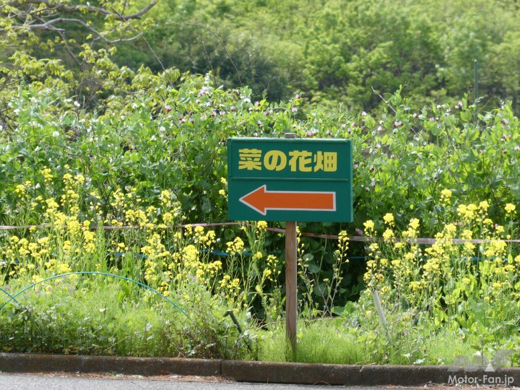 都道18号線(鎌倉街道)で南多摩尾根幹線道路を横切り、新袋橋交差点で都道57号線(芝溝街道)を西へ進む。しばらく行った先を南に進路を取り住宅地の中の坂を上っていく。見晴らしの良い丘陵に広がる農地が現れると、東側の山の斜面一帯が黄色に染まっていた。人の手によって作られた風景だが、満開の菜の花に彩られた景観は思わず息をのむ美しさだ。平日にもかかわらず大勢の見物客が訪れ写真を撮っていた。