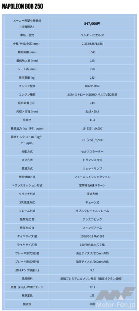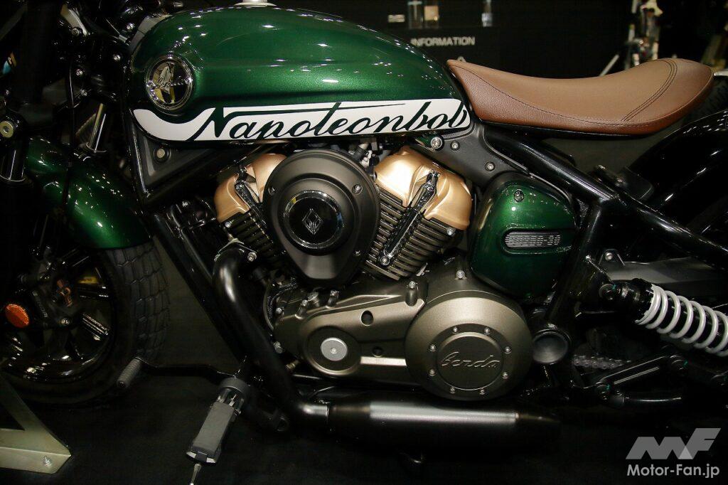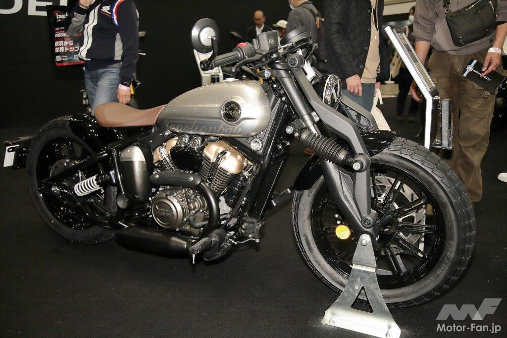 日本に導入されるのはクルーザータイプの「Napoleonbob 250(ナポレオンボブ250)」だ。東京モーターサイクルショー2026ブースでの展示車はまるでカスタムマシンと見まごう作り。プロトでは過去にハーレーエンジンを搭載したコンプリート車「ロードホッパー」を発売していた経緯もあり、他ジャンル同等以上にクルーザーへの造詣は深い。