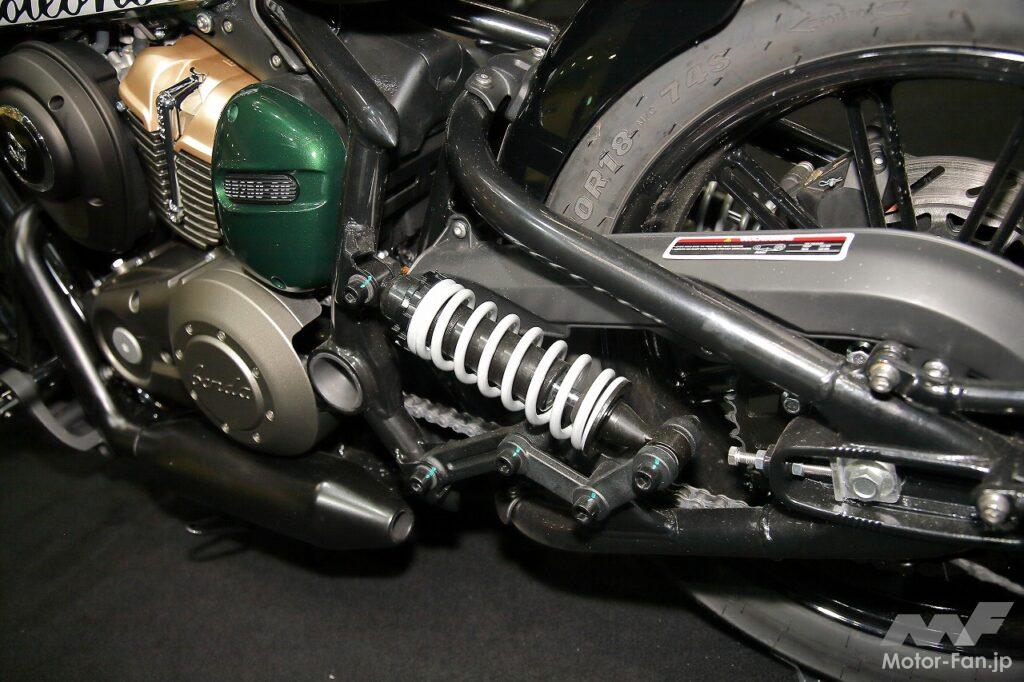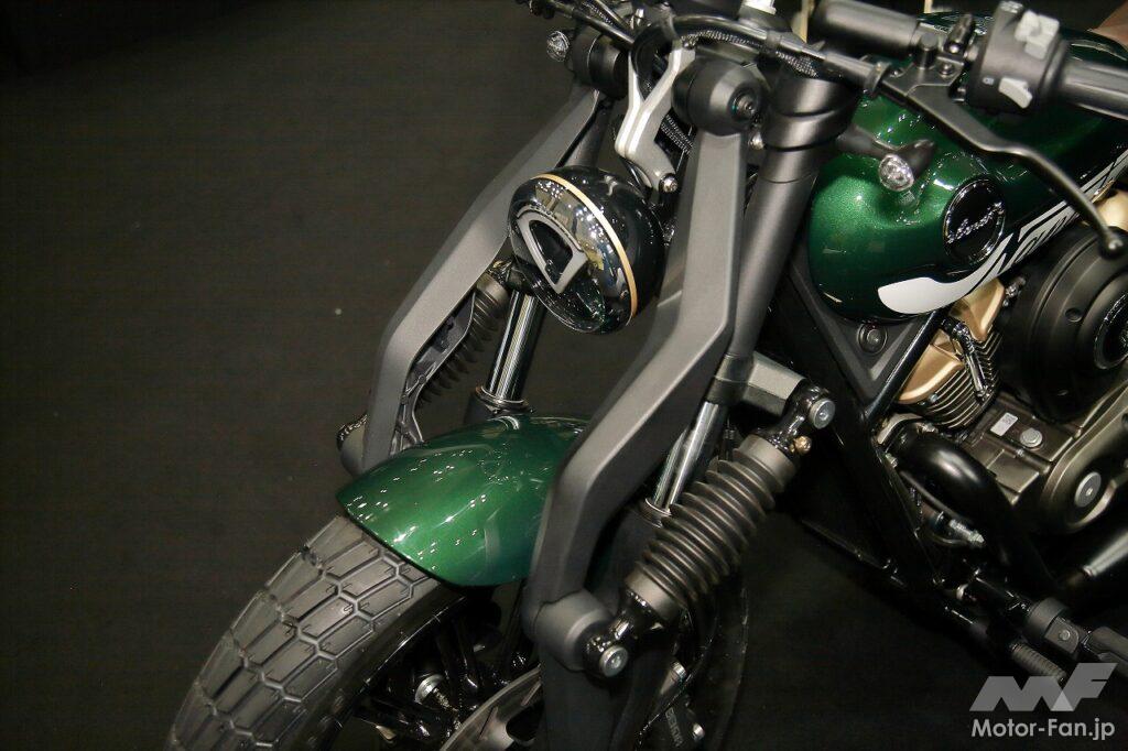 そして驚くのはフロントの足周り! テレスコピックのフォークに加えてサブダンパーを追加した独特なマルチリンク式となっている。これにトップブリッジから下方に伸びるアーム(カバー?)も備えられて唯一無二のルックスを実現。新世代のスプリンガーフォークとも呼べるユニークなディテールを実現している。