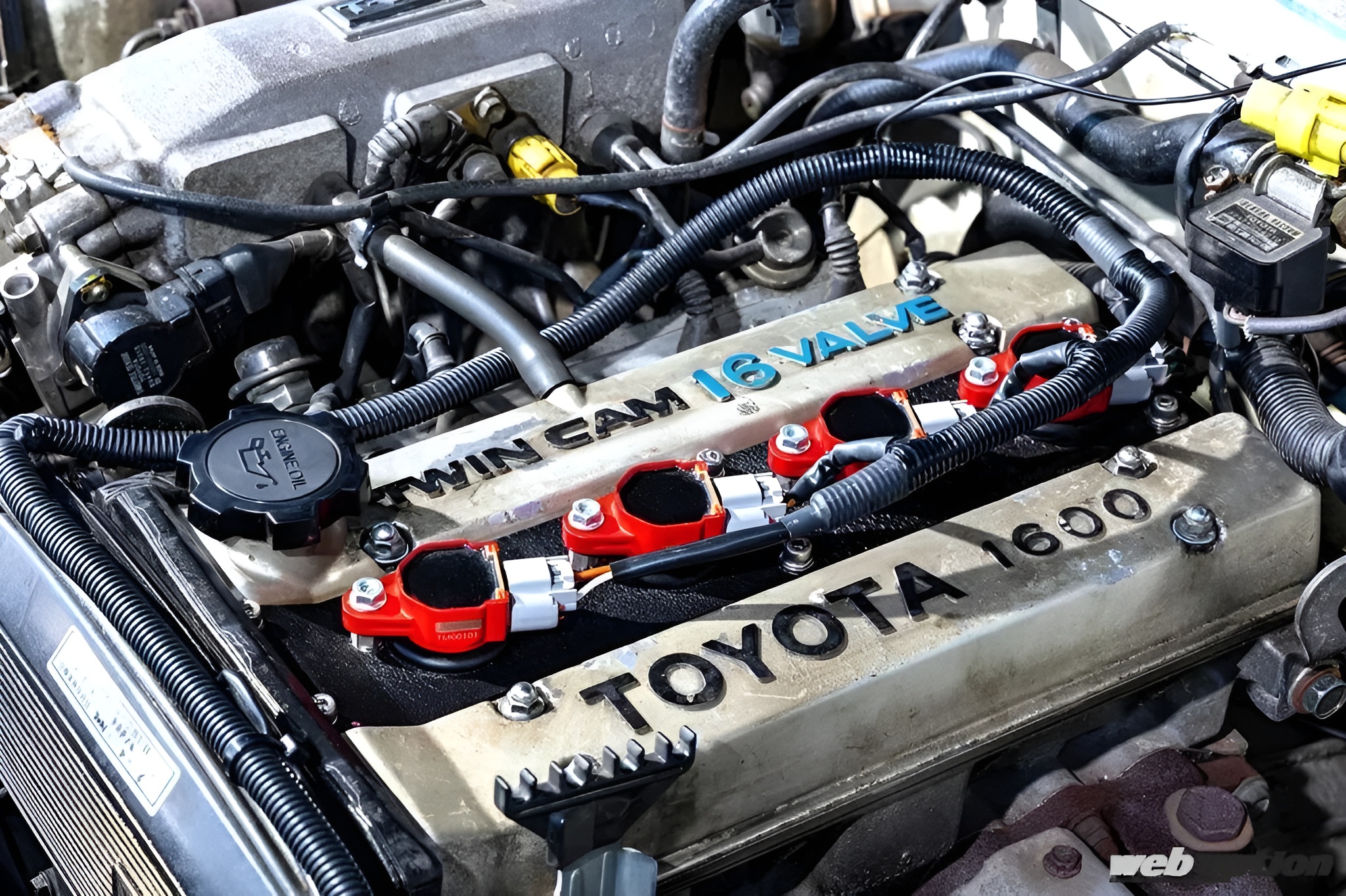 細部を見ていく。エンジンで唯一の変更点がダイレクトイグニッション化。通常はECUの変更が必要だが、TMワークスのハイパフォーマンスコイルダイレクトイグニッションキットは、ノーマルECU+配線加工なしで装着が可能。全域での安定した点火を実現し、パワーアップ&トルクアップが狙える。TMワークスでは、各種4A-G用にキットを設定しているそうだ。