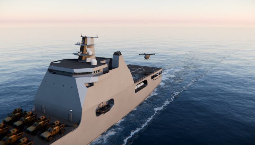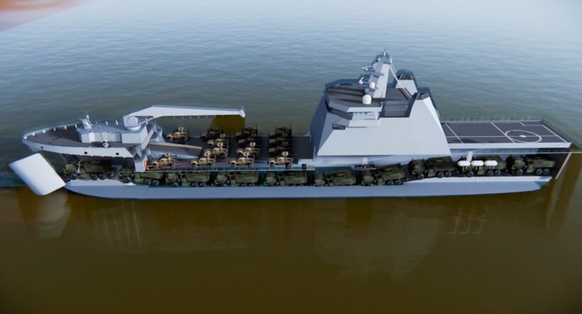 業界人コラム 海岸から海岸へ、神出鬼没のゲリラ戦を展開!? 新型揚陸艦をアメリカ海兵隊が公開【写真・5枚目】 建造予定の新型揚陸艦マクラング級のCG画像。全長100m、排水量4000トンというスペックは、既存の大型揚陸艦より小さく、一方で航続距離の短い小型揚陸艇よりは大きい。ゆえに「中型」揚陸艦である(画像/アメリカ海兵隊の公開動画より) 海岸に直接、艦首を乗り上げて部隊を展開させているLSM(中型揚陸艦)のイメージCG。 この画像の記事を読む