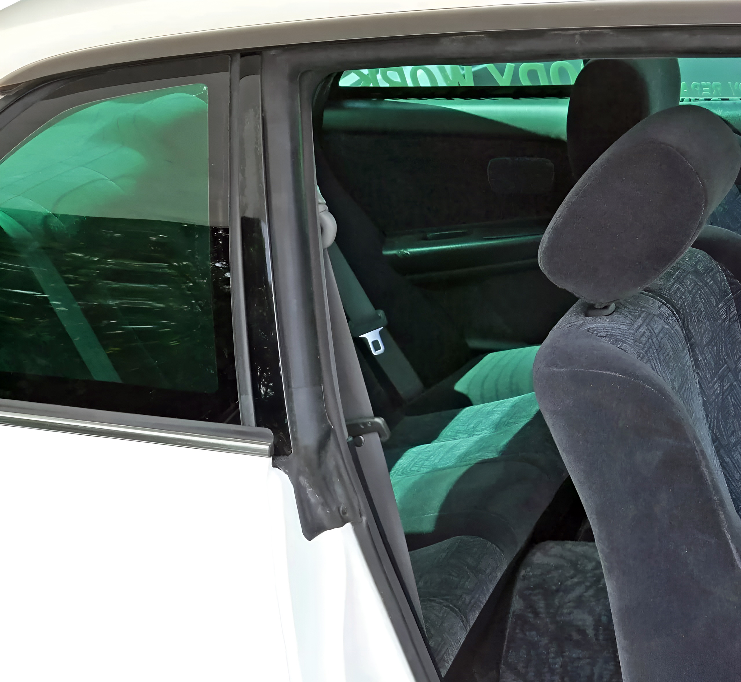 単なるショーカーで終わらないのが、このチューンドの凄いところ。激しいドリフト走行にも耐えられるよう、Bピラーはガッチリと再溶接した上でドア開口部のスポット点数も大幅に増やすことで、剛強ボディを作り上げているのだ。ちなみにウェザーストリップやモール類は2台分用意し、繋ぎ合わせて延長している。