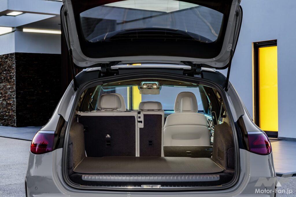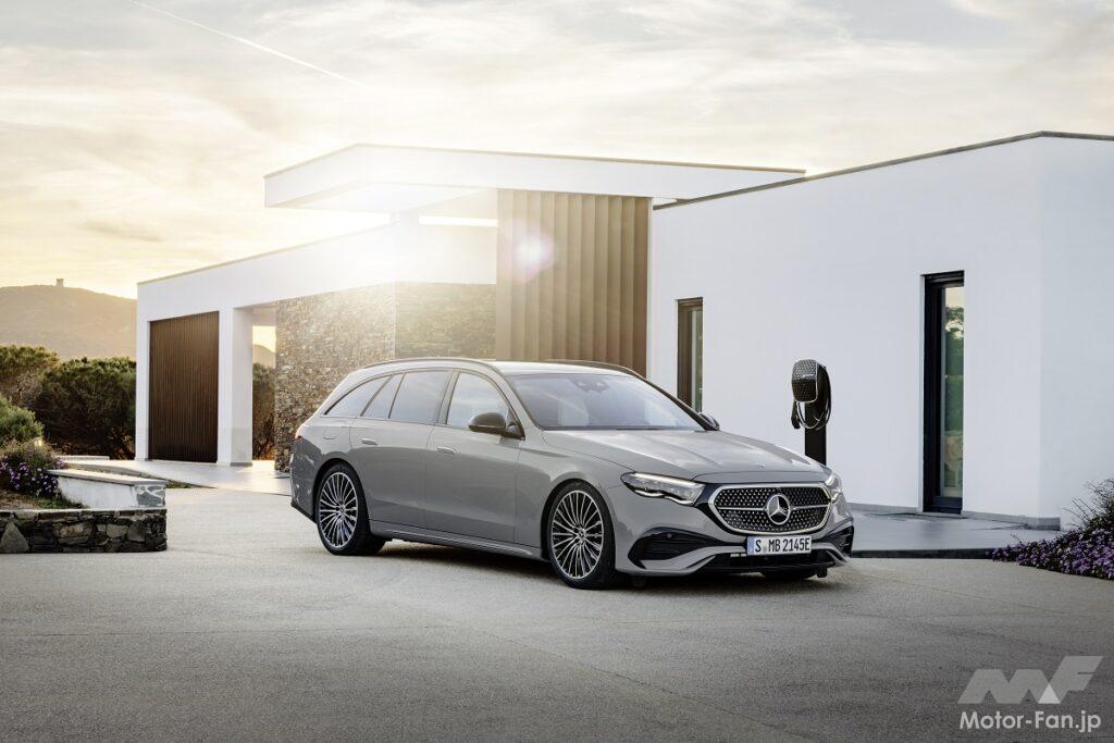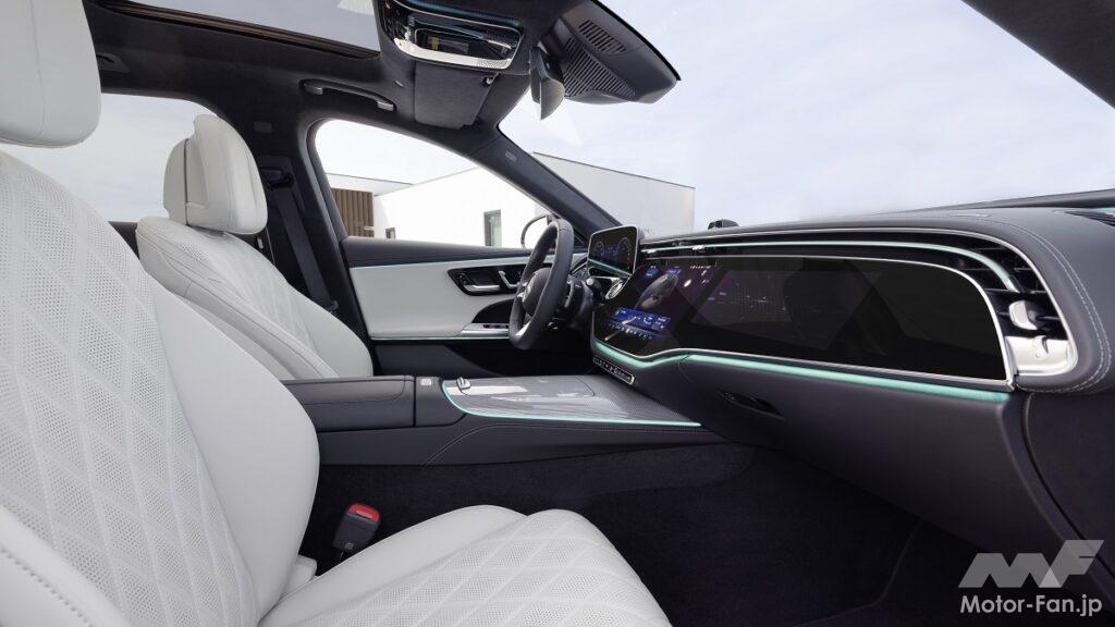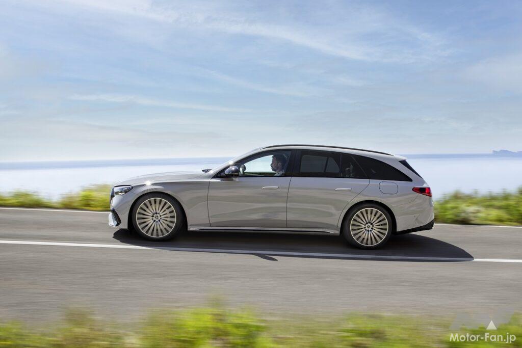 新型Eクラス・エステートは、先代モデルと比べて全幅が28mm拡大され、後席空間がさらにワイドスペースに。また、ホイールベースが2,961mm(+22mm)に拡大されたことによって、後席の膝前空間も1,519mmにまで広くなっている。サイドシルエットは、先代モデルと比べてもルーフラインがダイナミックにデザインされているが、機能性とラゲッジスペースにも抜かりはない。ラゲッジルームは、通常モデルで 615L(後席を倒すと最大1,830L)、プラグインハイブリッドモデルでは 460L(1,675L)が確保されている。