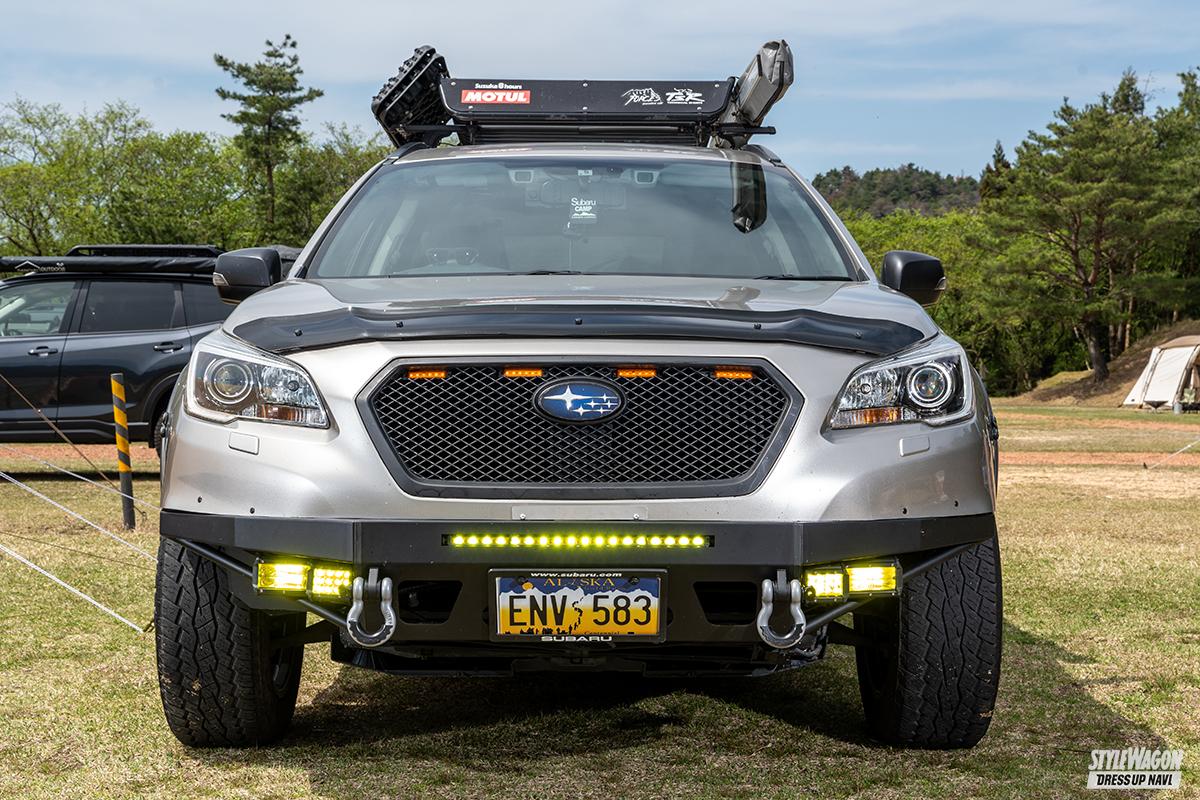 奥さまと2人でゆるキャン△を楽しんでいると思いきや、愛車のアウトバックにはハードなカスタムを施していたVAVAさん。最大の見どころは斬鉄剣でスパッと切り落とされてしまったかのような前後バンパーで、フロントに関しては「INTENS」が手がけるアイアンバンパーがLEDバーライト等と一緒に組み込まれている。ちなみにリア側はカットされたままの状態だが、WRX純正マフラーの流用装着やブラックアウト処理によって違和感なくフィニッシュ。1インチのリフトアップも併せてオーバーランダーらしさも全開なのでありました。ちなみに涼しい顔して「バンパーは消耗品」なる格言を残してましたがアッパレな心意気だと思います!!