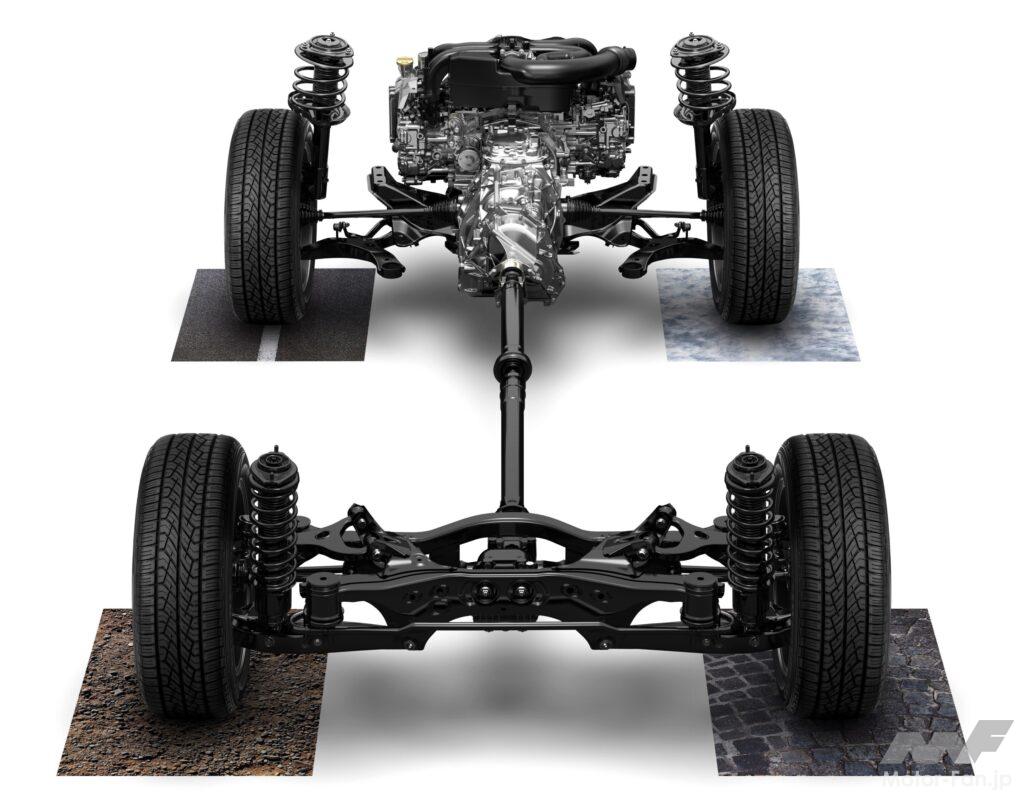 つまり、エンジン・トランスミッション・各デフ・プロペラシャフトがセンターに並び、等長のドライブシャフトが左右に伸びる、スバルが謳うところの「シンメトリカルAWD」にはなっていないということだ。なお、シンメトリカルではないものの、ドライブシャフトはデフから垂直に伸びている。