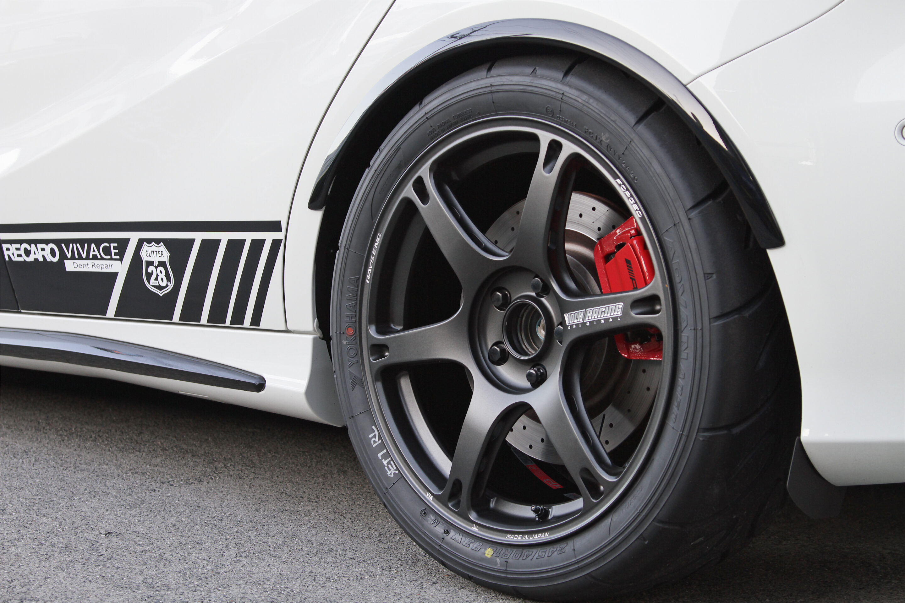 ホイールはボルクレーシングのTE037(9J+45)、タイヤはアドバンA050(245/40R18)を通しで履く。カーショップポルシェオリジナルのフェンダートリムも装着することで、このままでも問題なく車検を通すことができる。