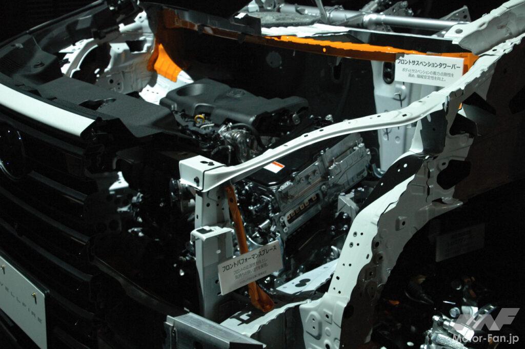 さらにヴェルファイアではラジエーター左右にフロントパフォーマンスブレースを追加し、アルファードを上回る剛性を確保。