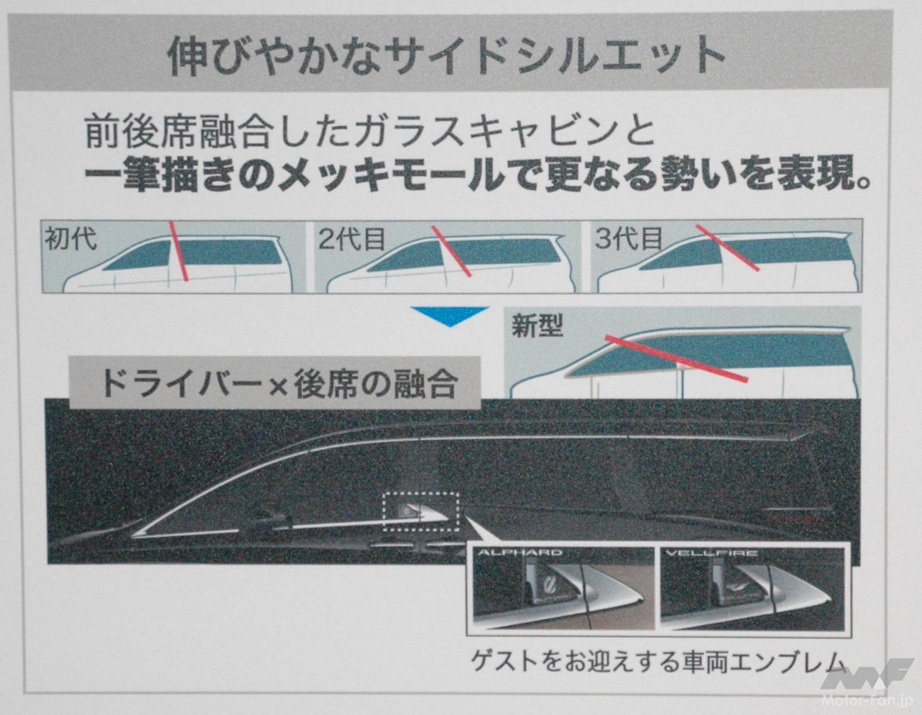 その代わり、Bピラーのリヤドア側には車種エンブレムを配した鋭角的なキャラクターラインを持たせている。このラインの角度こそがアルヴェルピラーのさらに鋭角化したデザインなのだ。