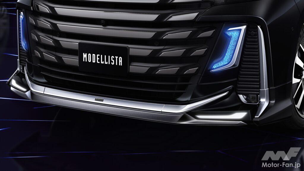 「MODELLISTA エアロパーツセット」の特徴は、ベース車の持つアグレッシブさをシャープなメッキパーツでさらに力強く、かつ先進的スタイルに創出している点だ。エアロパーツセットに加え、大胆なメッキとボディ色のコンビネーションが押し出し感を強調するフロントグリルや、コの字形状のメッキとブルーイルミで先進的な輝きとプレミアムな佇まいを付与するシグネチャーイルミブレード、横一文字に伸びたブルーのLEDを内蔵しリヤビューに迫力と煌めきをプラスするイルミルーフスポイラーなどを設定している。