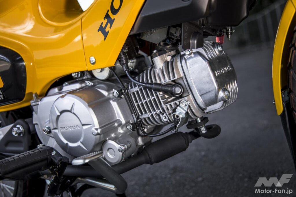 109㏄空冷SOHC2バルブ単気筒のエンジンスペックはスーパーカブとまったく同じで、低中速トルク型。もちろん自動遠心クラッチ式4速ミッションを備えている。2次減速比のちがいでクロスカブのほうが低速でより力強い走りを見せるが、まあほとんど体感できないレベルだ。