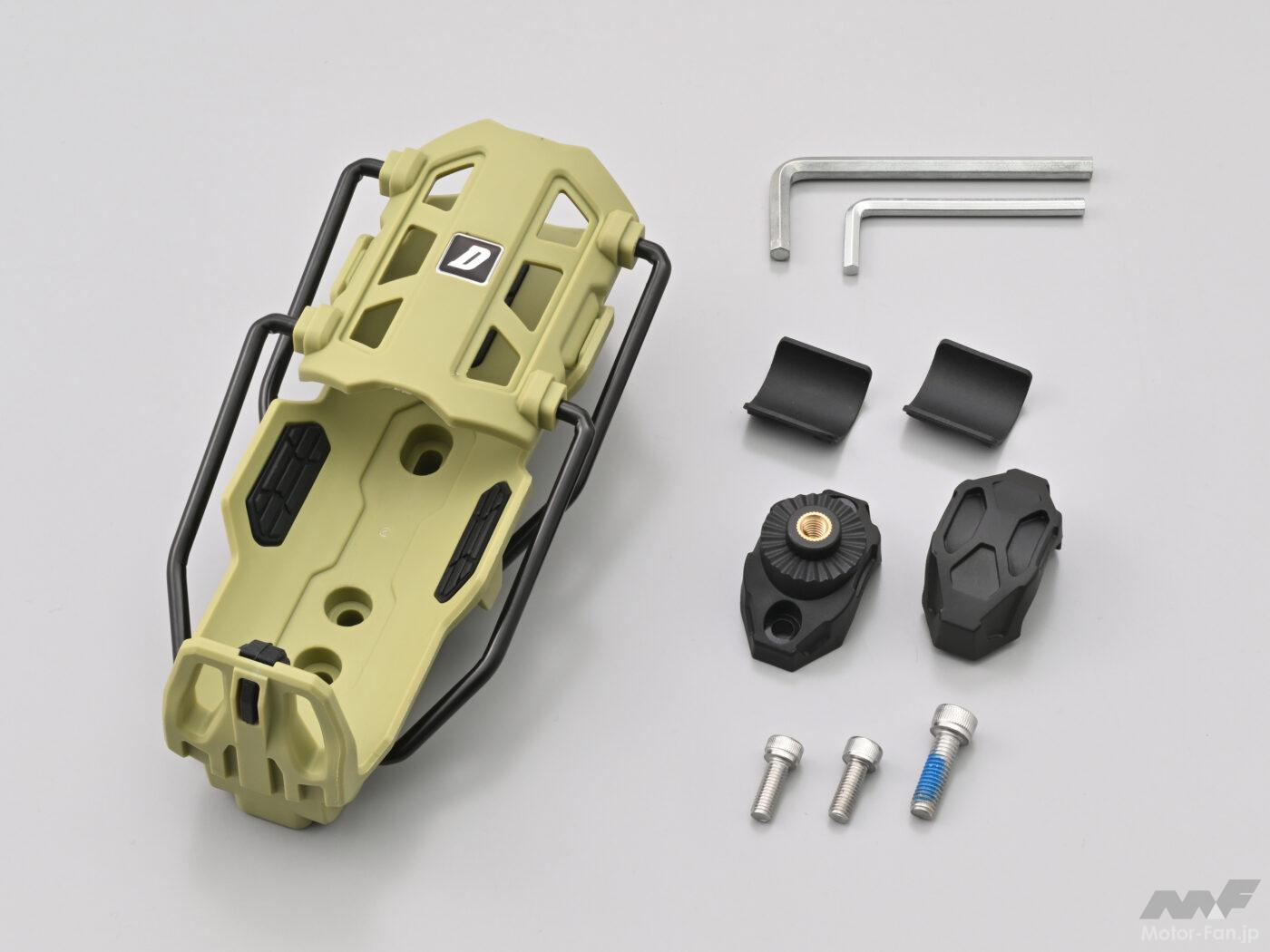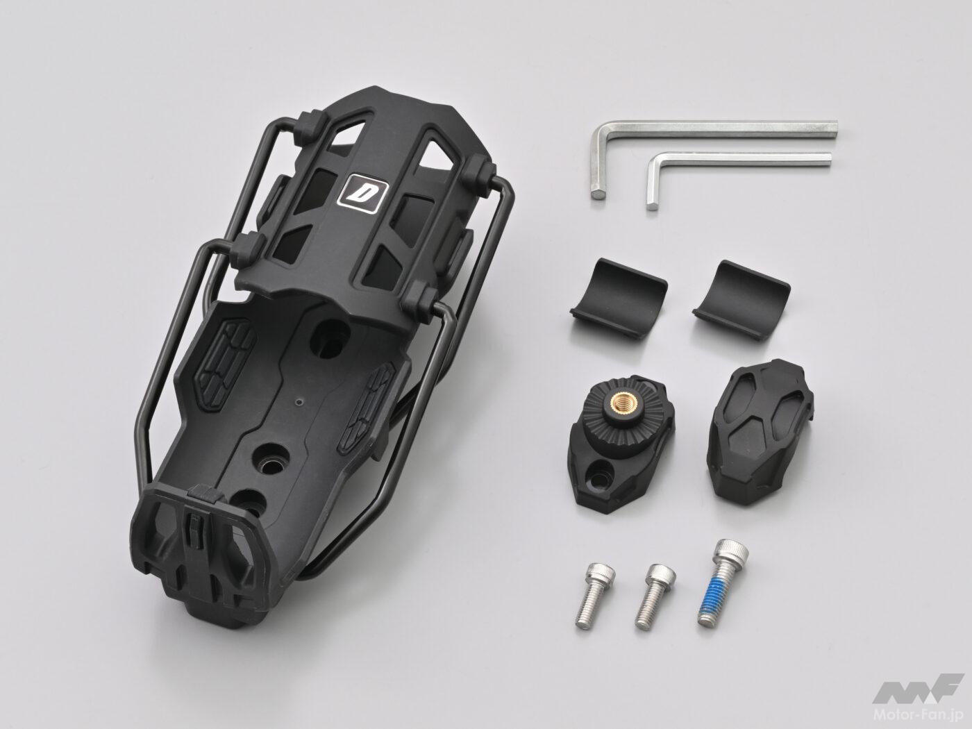 同品はハンドルバーやエンジンガードなど、外径Φ22.2mm/Φ25.4mmのパイプに取り付けが可能。本体は15°刻みで360°回転可能(※本体の回転には付属の工具が必要)。