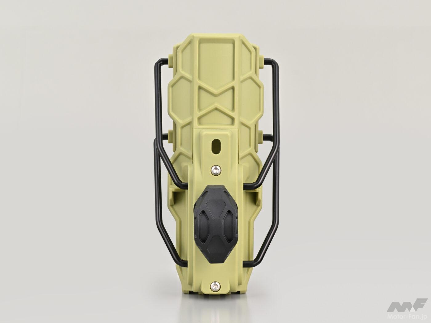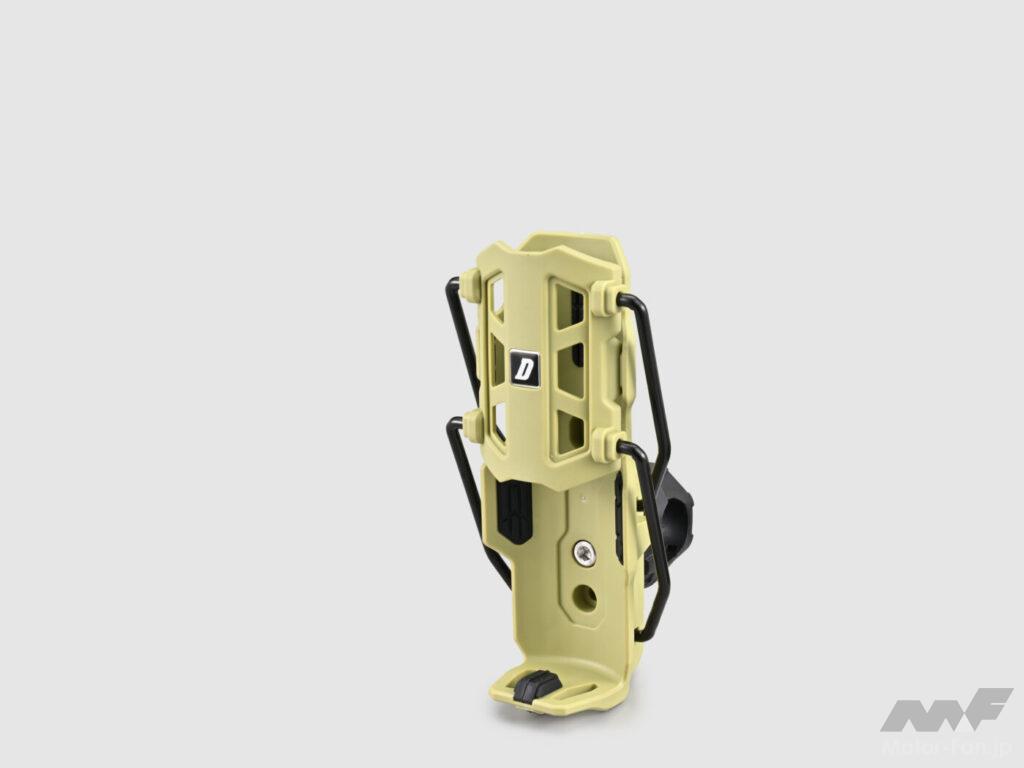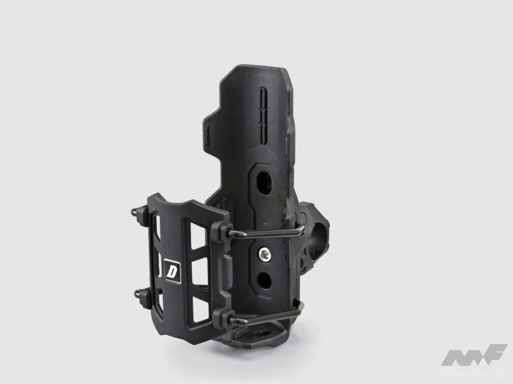 写真はバネの力でボトルをしっかりと固定できる、これまでにない新しいデザインのドリンクホルダー。飲み物のボトル着脱は非常に簡単。不使用時は折り畳めるため、ホルダー本体が目立ちにくいのが特徴。