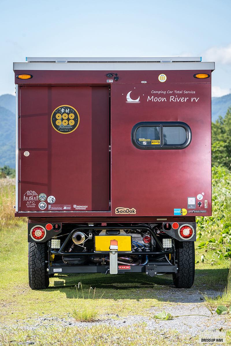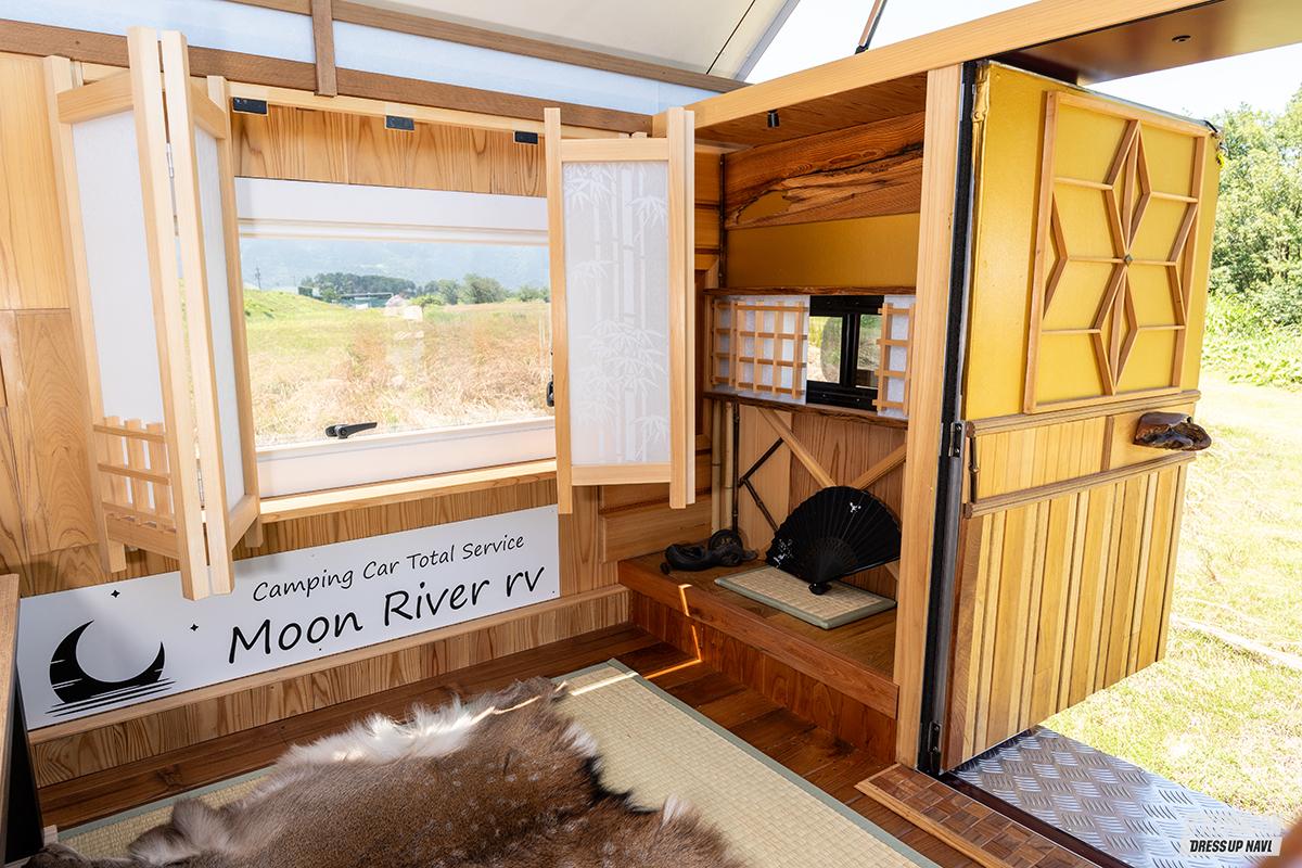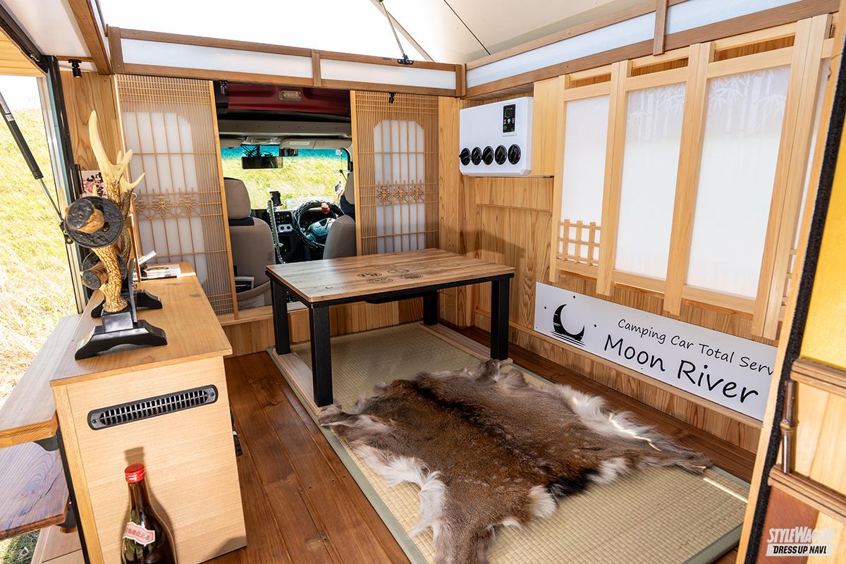 まるで茶室のような心落ち着く空間でありながら、単なる車中泊スペースに留まらないプラスαの要素を盛り込んだ荷箱。ワインレッドで車体全体をカラーコーディネイトしたキャンパーらしからぬセンスと合わせ、否が応でも目を引く存在です。