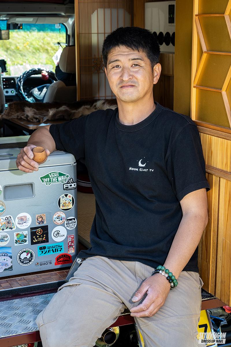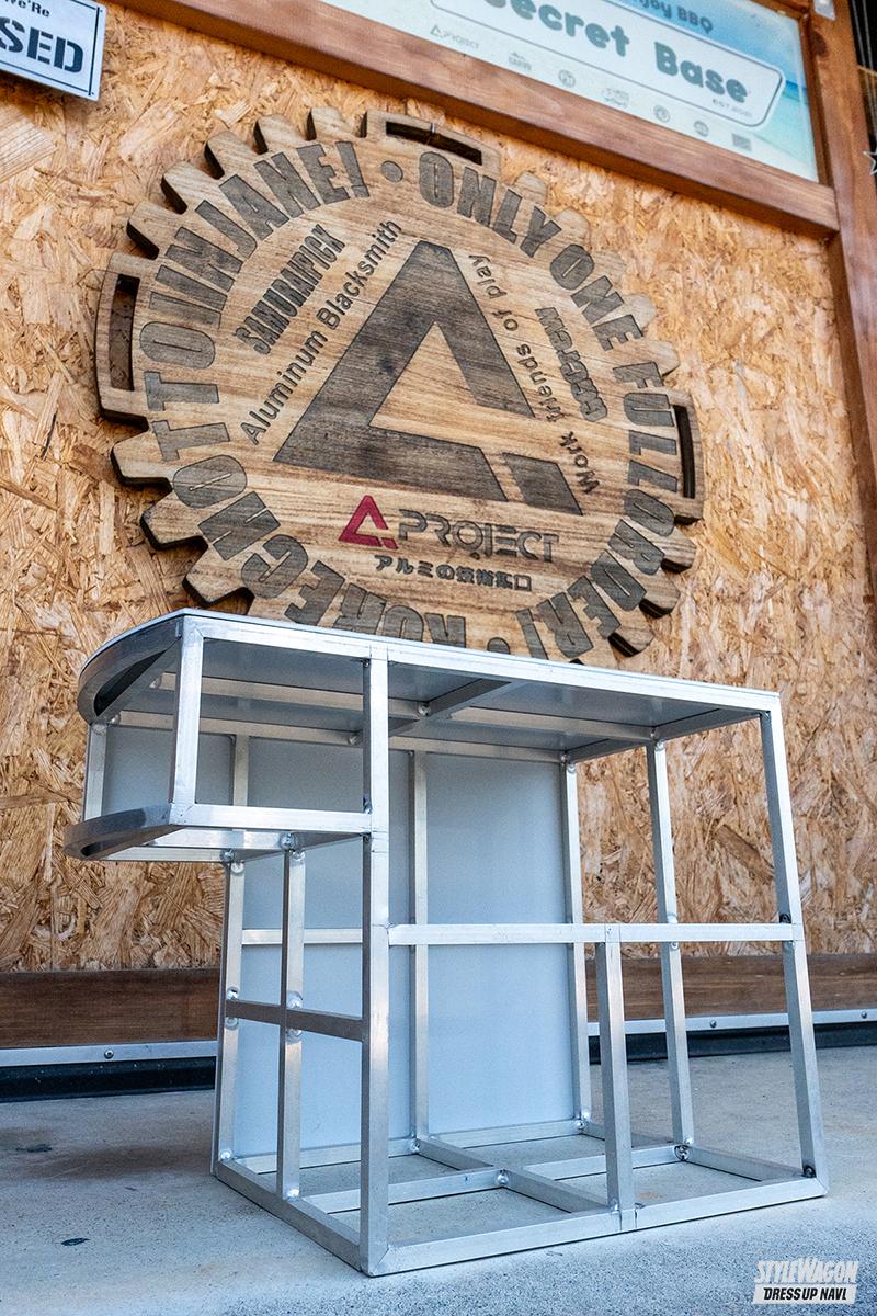 また、オーナーの幸村さんは本業であるキャンピングカーのリノベーション技術をフル投入し、独自に内装の和風モダン仕立てに着手。内壁に木目パネルを積極採用し、車外に向けたカウンターとしても使用できる木棚も設置。キャンプやイベント会場においてルーフパネルへプロジェクター映像を映し出しながら、即席の立呑みBARを開設して周囲の仲間達と楽しんでいるのである。