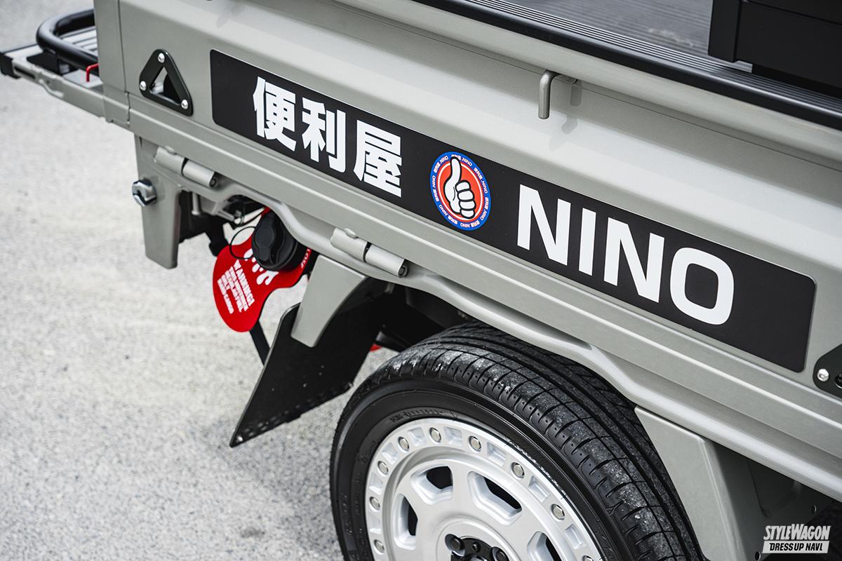 二ノ宮さんのスーパーキャリイは、最新のXリミテッドがベースなので、サイドのブラックラインやインナーブラックのヘッドライト、グリルやドアハンドルのブラックも標準装備。そんなXリミテッドをベースにフロントのスキッドグリル、オレンジマーカー、ルーフキャリア、ワークライト、アオリを延長するゲートプラス、荷台のボックス、サイドオーニング、さらにはアルミホイールまですべてハードカーゴ製。ハードカーゴのデモカーになりそうな仕様だが、二ノ宮さんがハードカーゴの大ファンで、神戸の本社にまで何度も出掛けて、ハードカーゴの社長と直接相談し、現在の仕様になったそう。現状、便利屋の仕事では打ち合わせや移動の足として使用するスーパーキャリイだが、地元の防犯パトロールなどにも活躍しているだけに、地元では有名な軽トラとなっているようだ。
