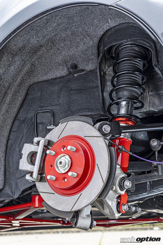 新意匠のスタイリングキットを始め、サスペンション、ボディ補強、吸排気、ブレーキなど数多くの部分にオリジナルパーツを投入してクルマ全体をトータルチューニングしているのだが、その中でもとくに印象的なのは貴島孝雄氏が自ら手腕を奮ったストリートスポーツサスキット(20万3500円)だ。