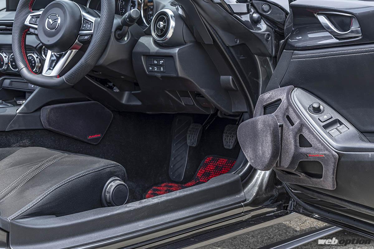 コンソールリッドも独自開発。S/NR-Aグレードなどに標準装備されている硬質樹脂製に硬さを感じるオーナーが多いことから、オートエクゼでは柔らかいソフトパッド仕様としている。これにより、ドライビング時の操作性と快適性を向上させる狙いだ。