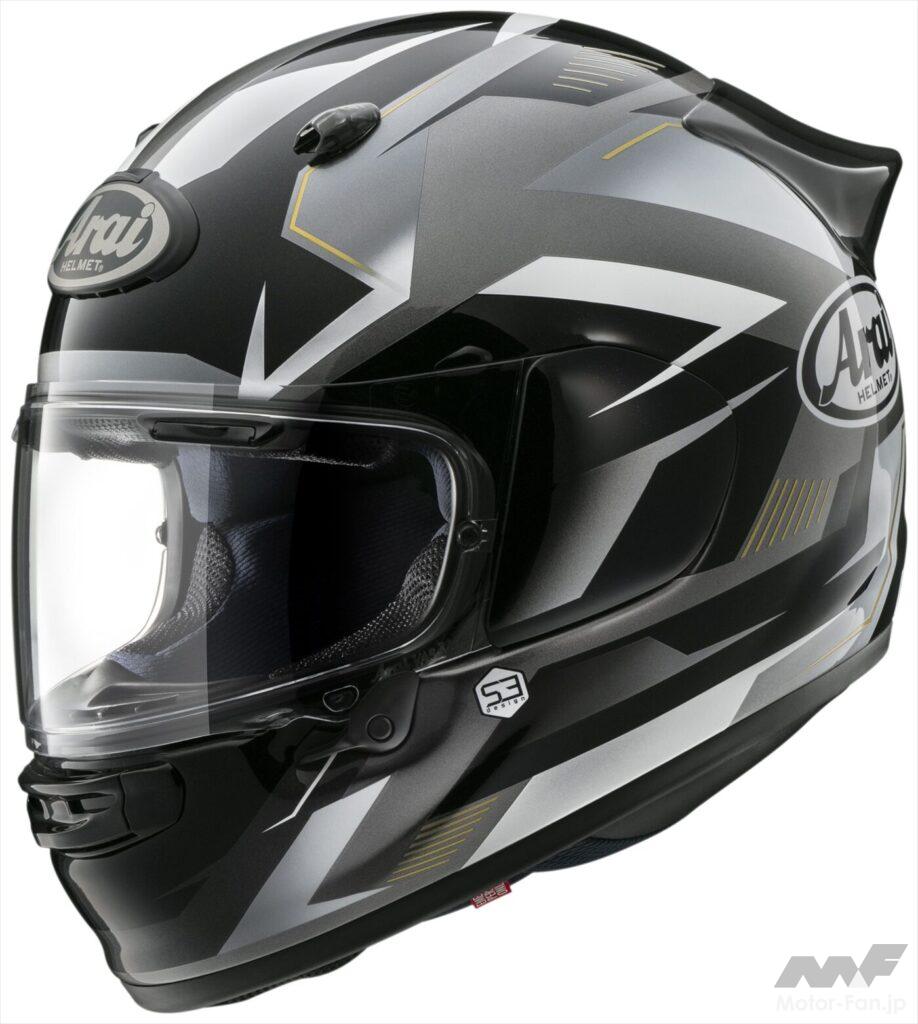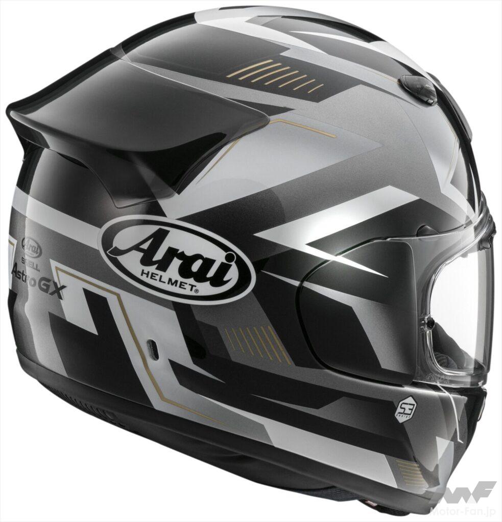 今回追加された「BEYOND(ビヨンド)」は、街乗りからサーキットまで、シーンを選ばないアストロGXの特徴を表した、定番で汎用性の高いグラフィック。どんな時代、どんなマシンにもマッチするスポーティでエッジーなイメージは、名の通り「ビヨンド・ザ・タイム(時を超えて)」を表象する。また、風を鋭く切り裂いて走るバイクの楽しさを表現したラインは、シックなカラーベースを採用し上質な大人の雰囲気も醸し出している。ロードモデルならどんな種類でも似合いそうな汎用性を備えるが、特に大型のフルカウルツアラーにはベストマッチしそうだ。
