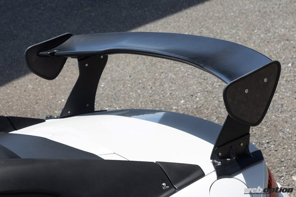 ダクト付きのエアロボンネット(FRP:8万8000円/平織カーボン:17万6000円)も設定。エンジンルームの熱気を効果的に排出することが可能で、オプションのボンネット用雨どい(1万7600円)を装着しておけば、雨やホコリの浸入も防げる。