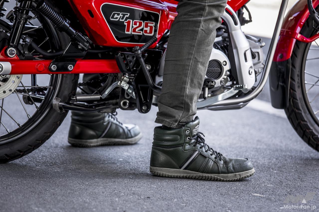 走行性は、しっかりとした直進安定性と素直で軽快なハンドリングを発揮してくれ、そこそこスポーティな走りも楽しめる。基本的に飛ばすバイクじゃないので、クセのない操縦性ならそれでOK。小回りやUターンもしやすいから狭い場所へも入り込んでいける。今回は砂が浮いた舗装林道や所どころ荒れたダート林道を少しばかり走ってみたのだが、恐怖心を抱くことなく走ることができた。オフロードバイクというカテゴリーで考えればCT125・ハンターカブの車体はコンパクトなので、荒れたダートやぬかるんだところも、それこそ二輪二足で走り抜けることができる。標準装備のタイヤはオン・オフタイプだが、林道ツーリング中心に使うなら、IRCのFB3に換装する方法もある。このブロックタイヤに変更することで、かつてのCT110イメージに近づけることもできる。