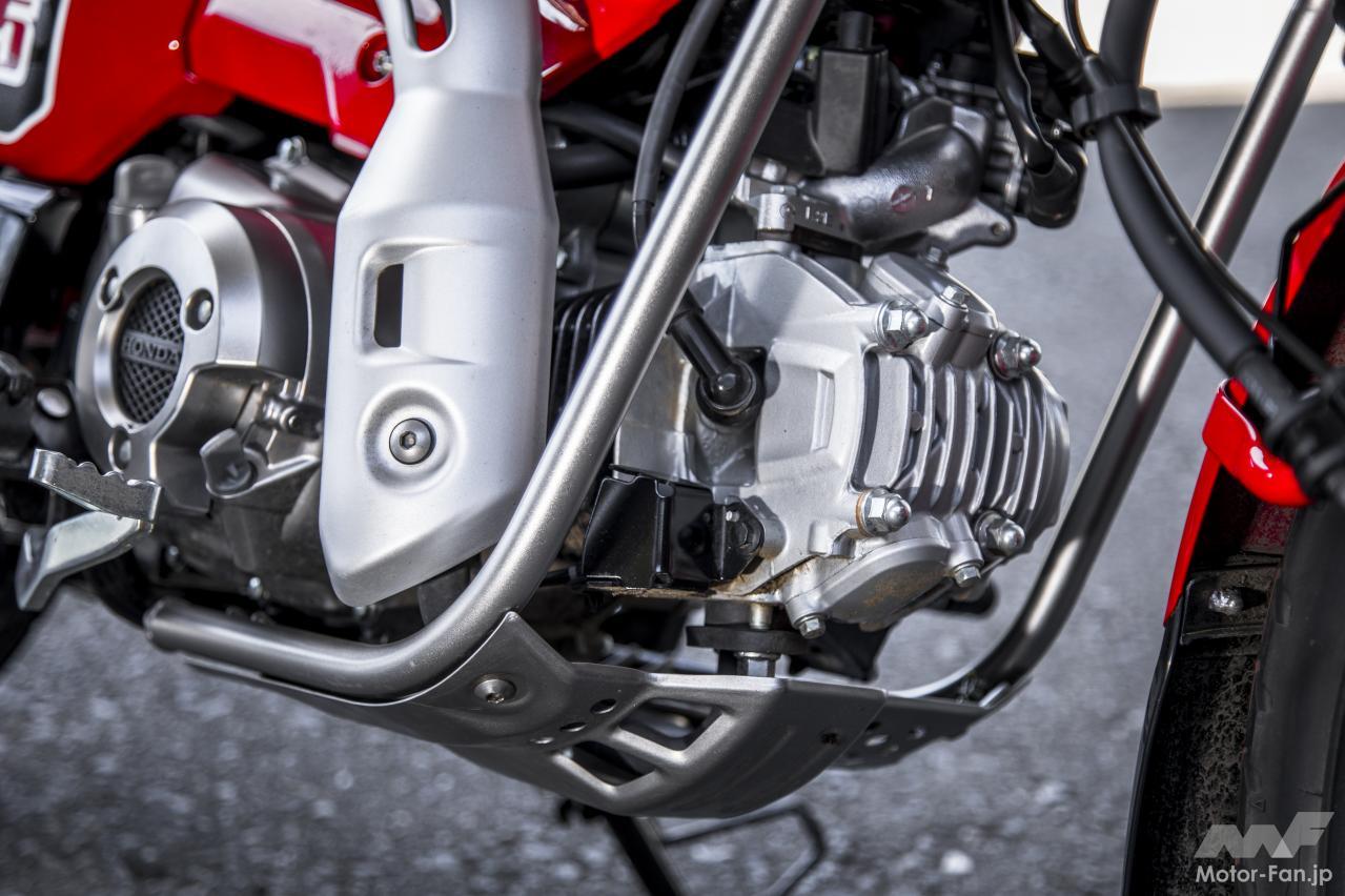 そんな武骨なボディを形成するフレームは、スーパーカブC125の骨格をベースに、延長したリアフレームやヘッドパイプまわりの補強、ピボットプレートの追加などで剛性バランスの最適化を図った新設計のバックボーンフレームとなっている。