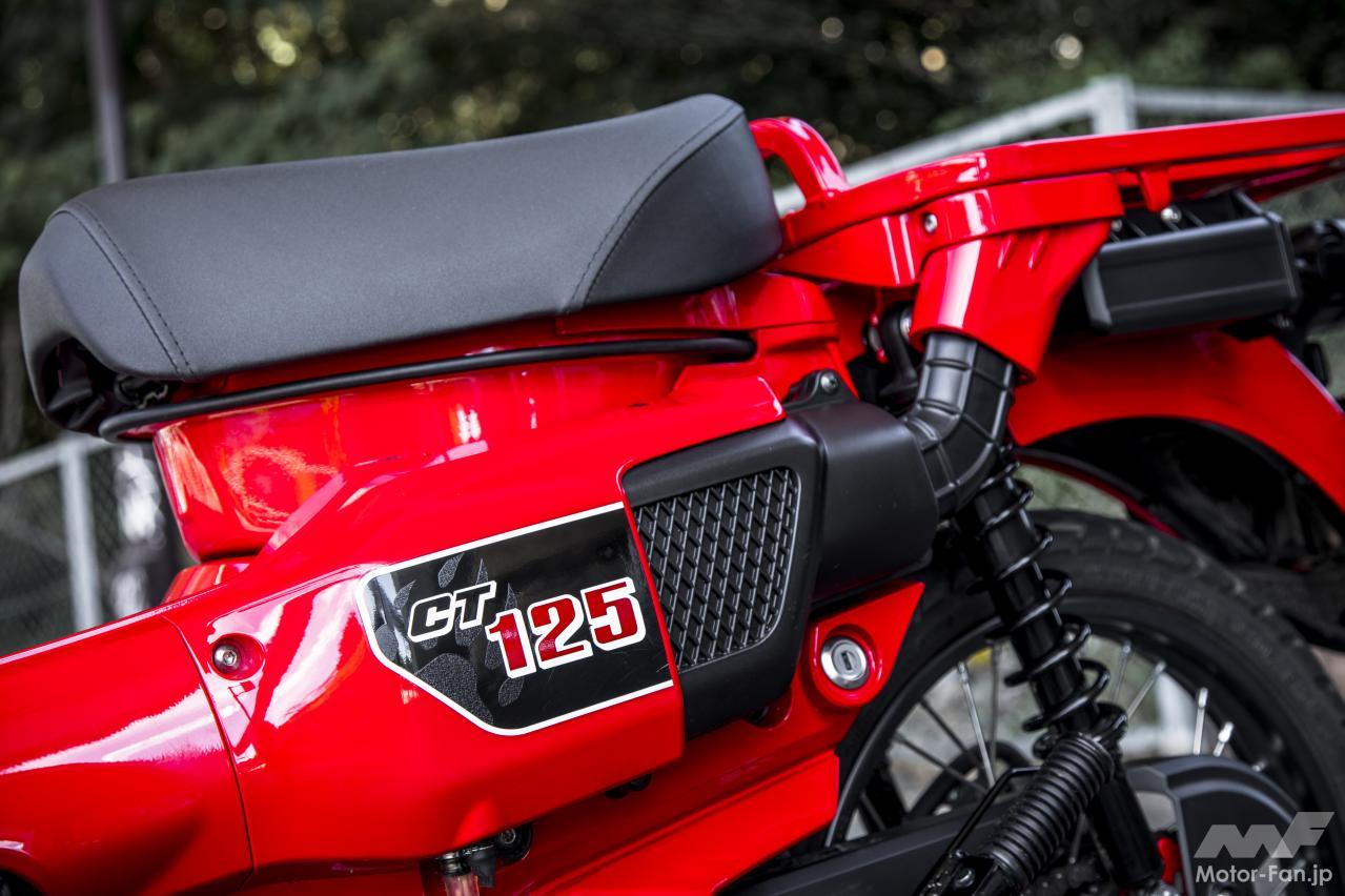 始動すると、排気音がはっきりと耳に届く。アップマフラーであることに加えサウンドそのものも迫力がある。音量があるといってもそれは、他車に存在を認知させるのに有効な大きさで、早朝の出発に気を遣うほどではない。いずれにしても、バイクは音がないと魅力が半減してしまう。静粛性は大切だけど程度問題だ。そういう意味でCT125のサウンドは合格である。