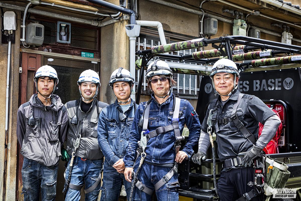 電気・通信系の工事を行うのが田中さんが経営する「テクネス」という会社。以前は写真のような装備を身に付け、自ら電柱に上って工事も行っていたが、現在、現場作業はスタッフにお任せ。現場に出向き、仕事の進行具合などをチェックするのが、社長である田中さんの主な仕事だ。普通、工事現場で見かける軽トラとは大きく異なるフルカスタムされた軽トラだけに、よく目立つし、社長が来ていることもわかる、営業車的な利点もある。