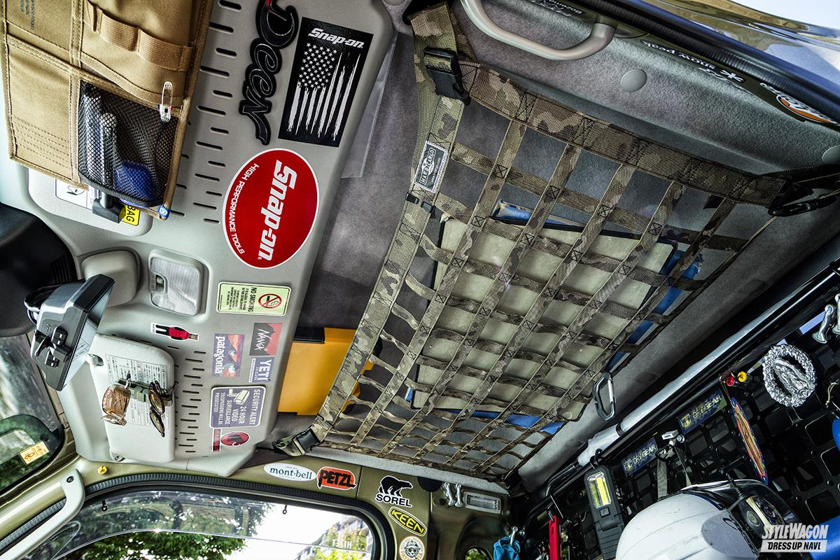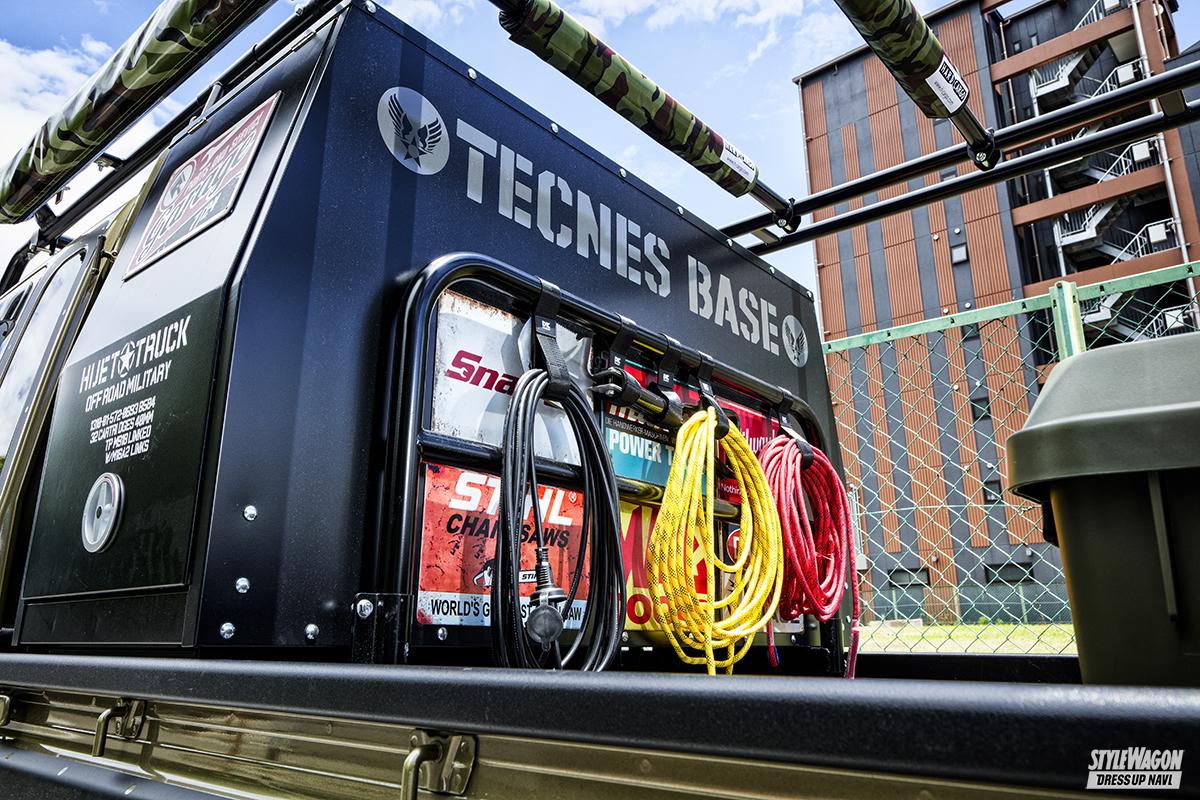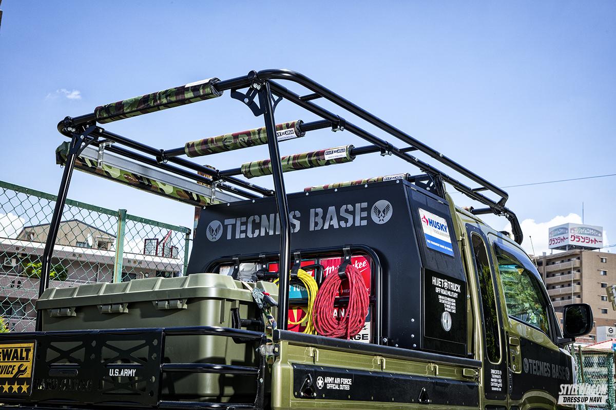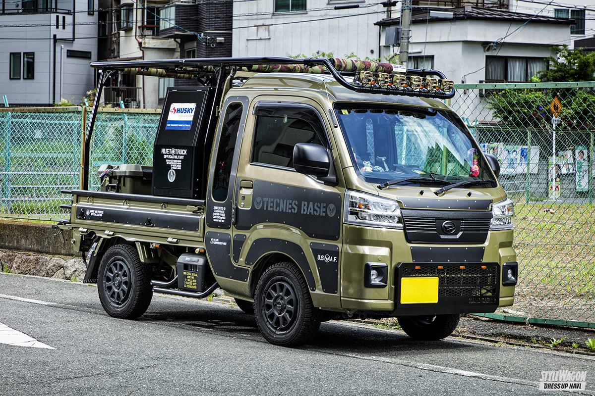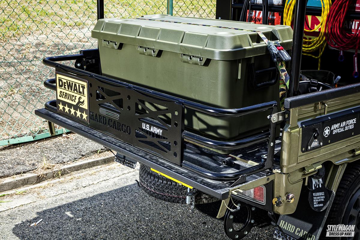 ハイゼットジャンボは田中さんに軽トラの楽しさを教えてくれた知人が、そのような仕様だったこともあり、キャリアからボックス、内装アイテムまで、ほぼハードカーゴのフル仕様。そこにカラーリングやオリジナルの社名デカールなどで、自分好みのミリタリーテイストを加えることで、個性的でカッコいいカスタム軽トラに仕上げている。今後は「山にもよく行くので、悪路でもヒットしにくいショートバンパー」なども考え中なのだ。