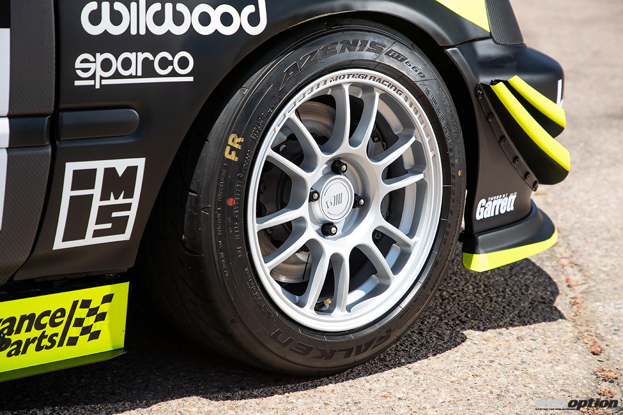ホイールはMotegiのMR146 SS6(FR15×8.0J+28)で、タイヤにはアゼニスRT-660(F205/50-15 R225/50-15)を組み合わせる。ブレーキもウィルウッドのキットで強化済みだ。