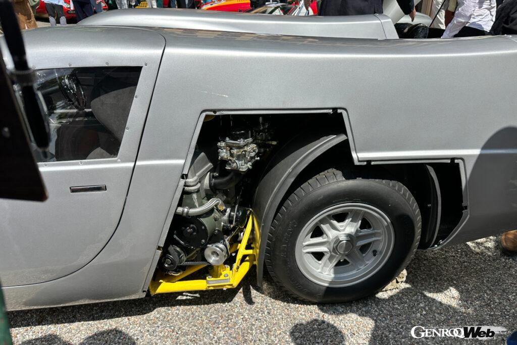 クラスGに並んだなかでも驚きのレアモデルが、これまたお隣の1967年式「OSI シルバーフォックス・プロトタイプ」だ。現物を見るのはもちろん初めて。双胴船のようなスタイルで、一見してどこにエンジンが入っているのかまるでわからない。バイクを2台つなげただけかと思ったほどだ。エンジンは左後輪の前に斜め45度の角度で収納されていた。アルピーヌの1100ccだ。2つのボディをつなぐブリッジはスポイラーとして機能し、フロント内部には前アクスル、リヤにはギアボックスと後アクスルが収まっていた。OSIは元ギアのデザイナーが興したカロッツェリア。奇怪な姿なのに見れば見るほど美しい。イベントの間中、ことあるごとに写メられていた。