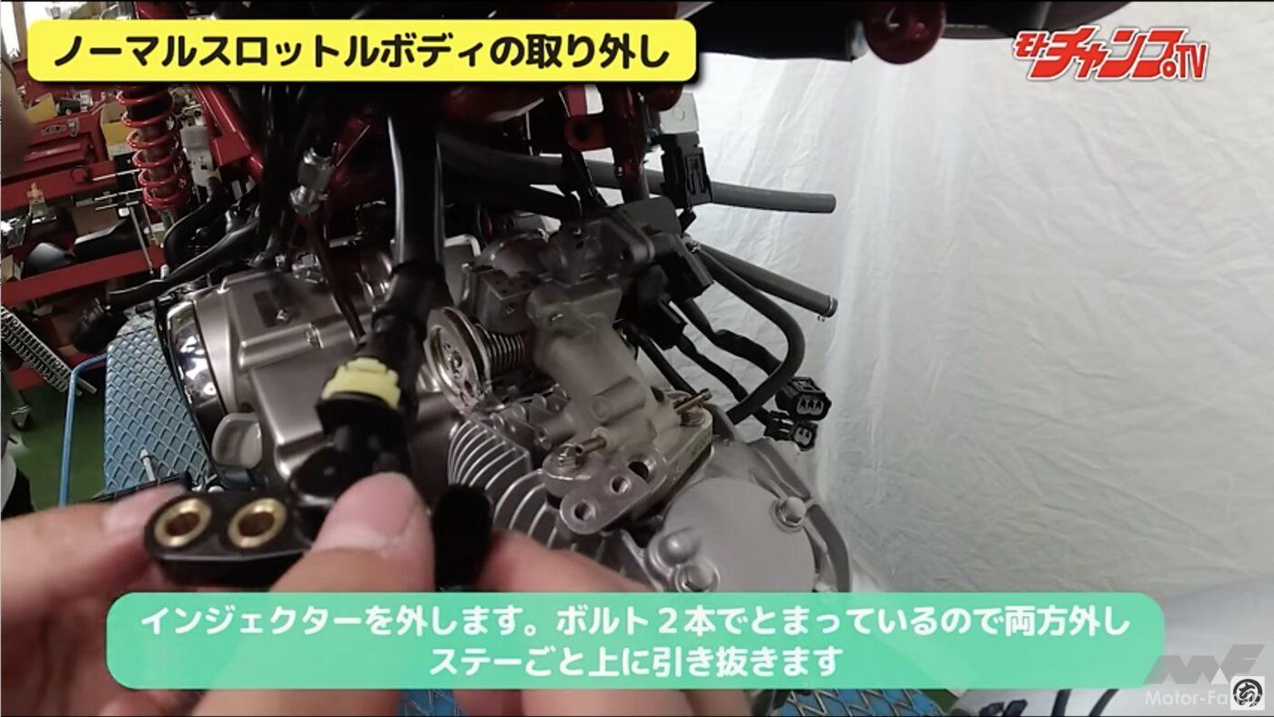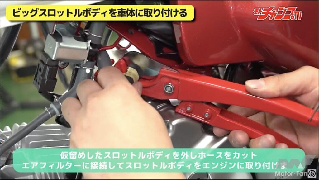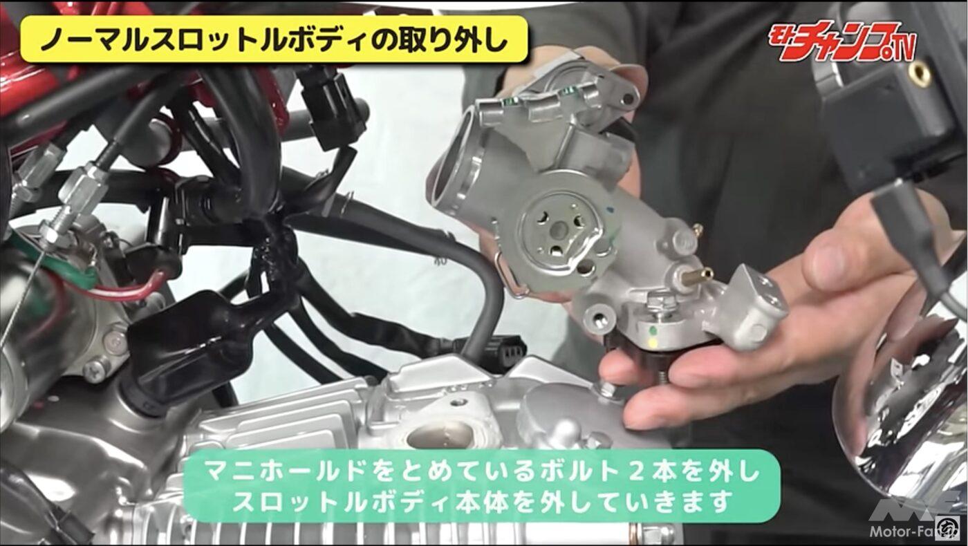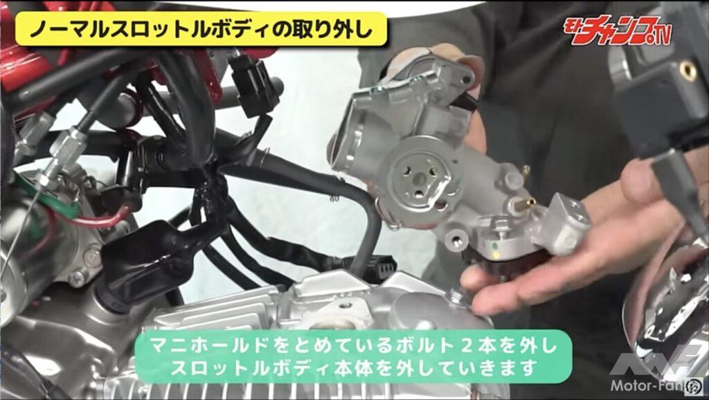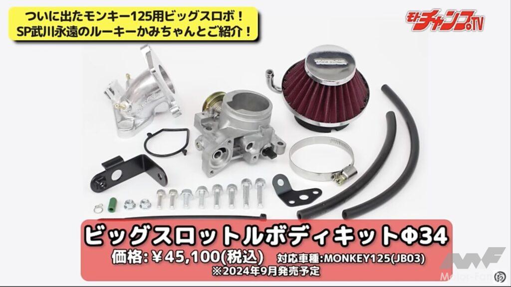 エンジンチューニングを楽しむ方法には色々な手段があるが、最もお手軽なのが吸排気系の変更だろう。特にマフラー交換は人気のカスタムだが、排気系だけ変更しても速さにはほとんど貢献してくれない。同時に吸気系を変更して吸排気効率を見直すことが肝心だ。SP武川では吸排気系アフターパーツを数多くリリースしている。今回はその中からモンキー125用のビッグスロットルボディキットの装着手順を紹介したい。例によってYOUTUBEで無料動画を配信している「モトチャンプTV」にアップされている「モンキー125をパワーアップしちゃおう! SP武川製ビッグスロットルボディキット装着解説!」という動画をダイジェストにまとめたものだ。