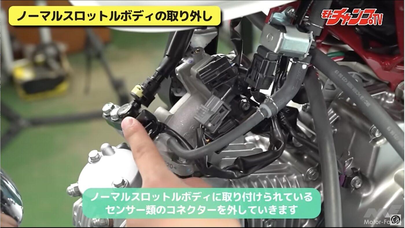エアクリーナーボックスが外れたら、いよいよ純正のスロットルボディを取り外す。手順が多いので、ここでも順を追って写真で説明していこう。